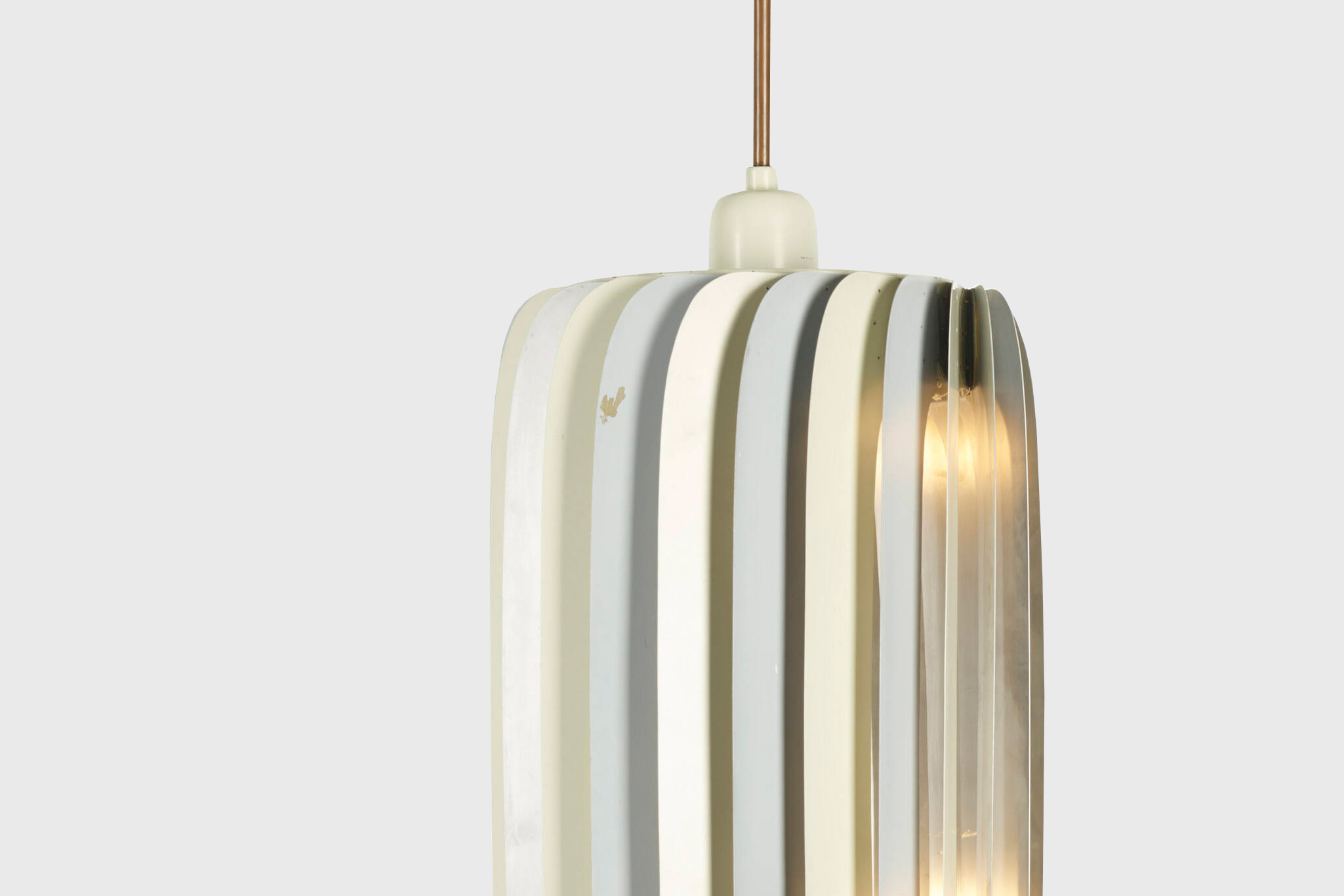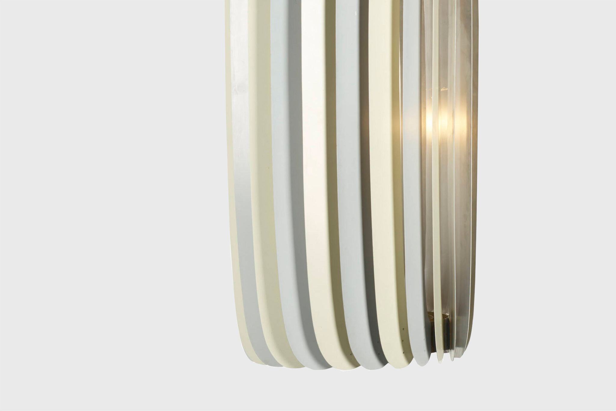 The layered construction softens glare while creating a sculptural volume that changes subtly as light interacts with the curved metal surfaces. Both functional and architectural in presence, the lamp reflects the mid-century Scandinavian pursuit of harmony between design, craft, and space. Its scale and serene rhythm of repeated elements make it an atmospheric focal point, originally conceived to elevate the contemplative interior of a church.