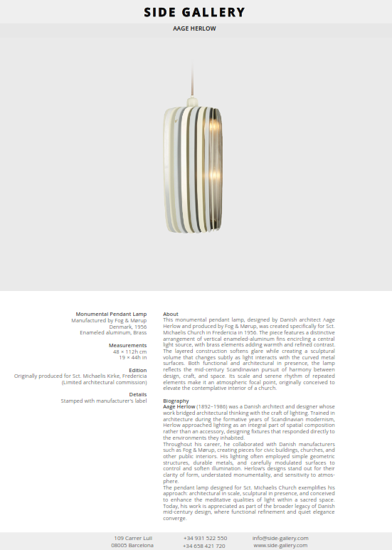 Throughout his career, he collaborated with Danish manufacturers such as Fog & Mørup, creating pieces for civic buildings, churches, and other public interiors. His lighting often employed simple geometric structures, durable metals, and carefully modulated surfaces to control and soften illumination. Herlow’s designs stand out for their clarity of form, understated monumentality, and sensitivity to atmosphere.
