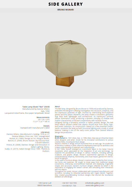 Designed during a formative moment in Italian postwar design, the Bali lamp reflects Munari’s belief that objects should arise from clarity, logic, and poetic reduction. Its construction—based on a few essential components—positions the lamp as both functional lighting and a study in visual balance, making it one of the early iconic pieces from Danese Milano’s design-led production.