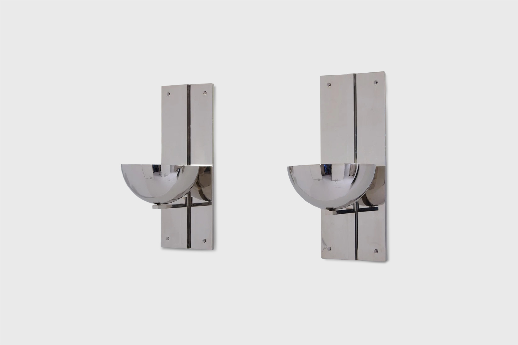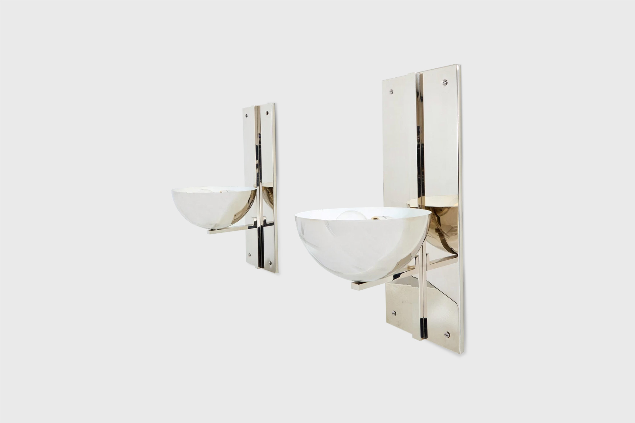 This rare pair of French wall lights was designed in 1992 by visionary architect Claude Parent for a private residential commission in Paris. Crafted from polished nickel steel, each light features a striking globe form, elegantly finished in reflective nickel on the outside and white enamel on the inside to amplify the glow. The sculptural geometry and refined materiality of the pieces reflect Parent’s modernist architectural principles translated into lighting design.