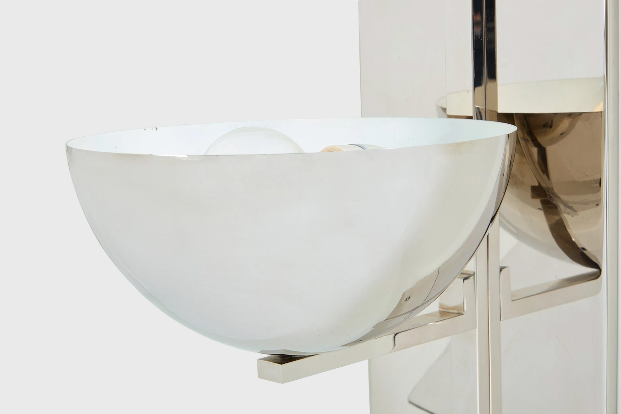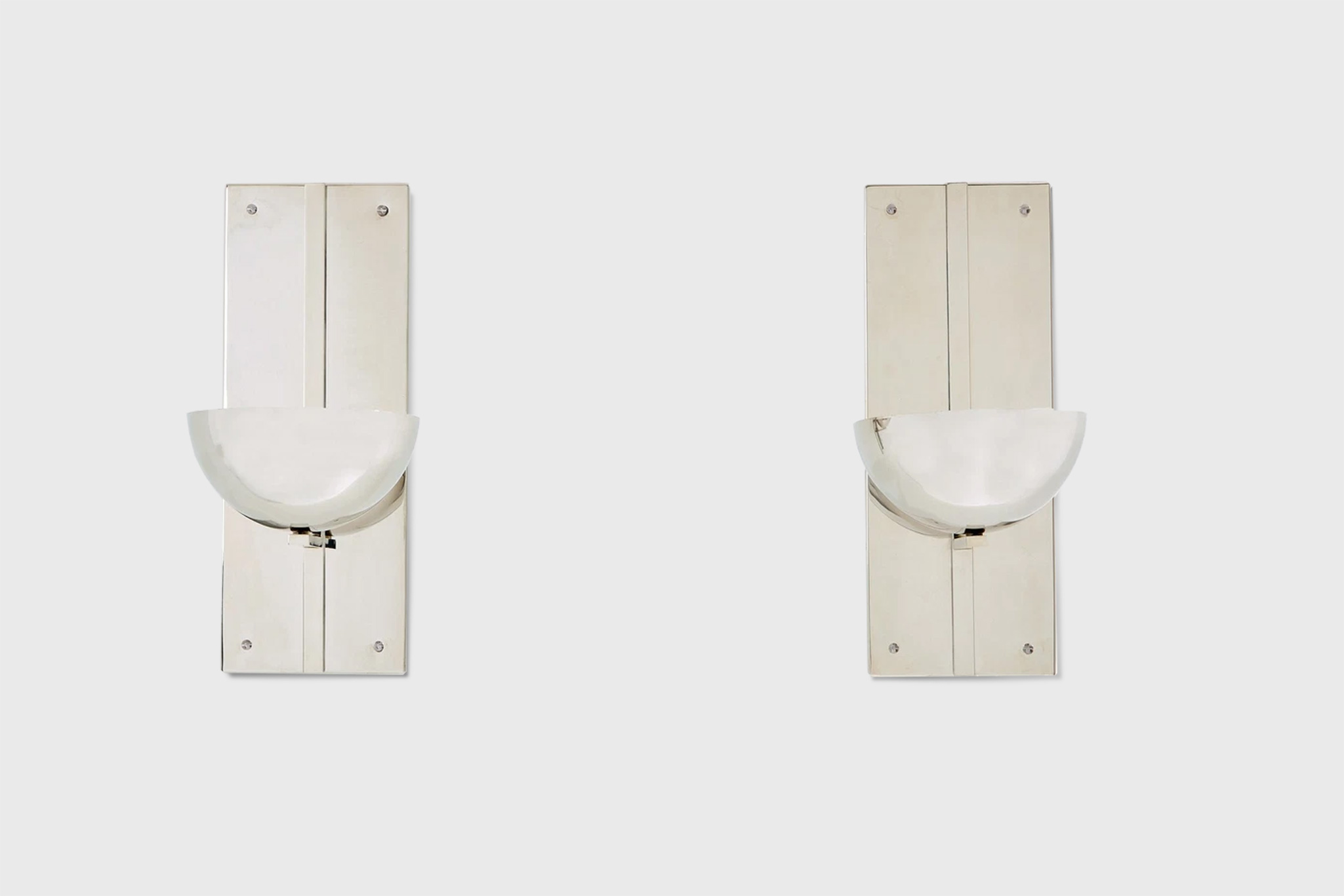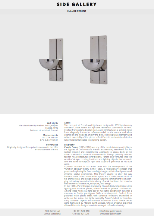 In the 1990s, Parent began translating his architectural principles into lighting and furniture pieces, often created for private commissions. Among these works is a rare pair of wall lights designed in 1992 for a mansion in Paris’s prestigious 16th arrondissement. Crafted from polished nickel-plated steel, with spherical reflectors enamelled in white on the inside, the lights exemplify Parent’s talent for transforming utilitarian objects into minimal, monolithic forms. These pieces were fabricated by Ateliers Saint-Jacques, whose artisanal expertise allowed Parent’s designs to retain a raw yet refined materiality.