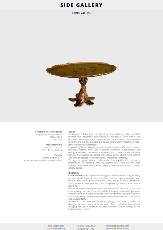 Centerpiece / Table Jewel, designed by Conie Vallese in Milan in 2026, reflects the designer’s exploration of sculptural form within the domestic landscape. Cast in bronze, the piece moves fluidly between function and object, occupying a space where utility becomes secondary to material expression.
