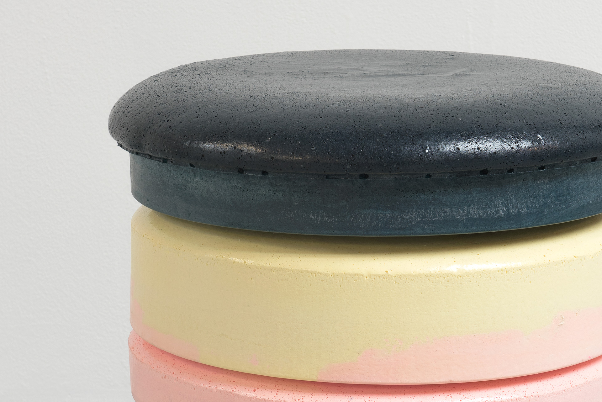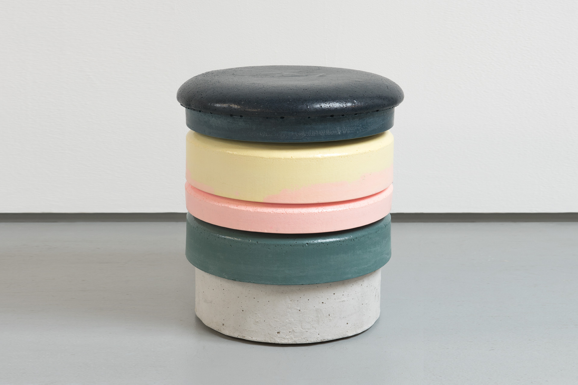 Constructed from polyurethane infused with pigments, anchored with concrete, and finished with cork, the stool embodies Andersen’s interest in combining industrial materials with an almost edible aesthetic. The resulting form is simultaneously familiar and uncanny: it recalls a sweet pastry, yet its heft and density underline its presence as a functional object.