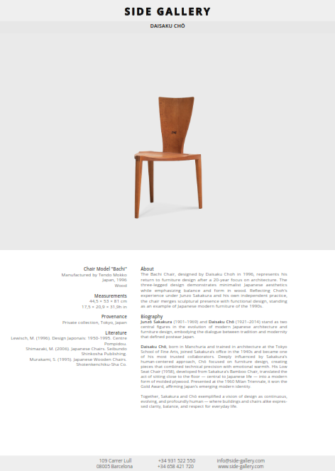 The Bachi Chair, designed by Daisaku Choh in 1996, represents his return to furniture design after a 20-year focus on architecture. The three-legged design demonstrates minimalist Japanese aesthetics while emphasizing balance and form in wood. Reflecting Choh’s experience under Junzo Sakakura and his own independent practice, the chair merges sculptural presence with functional design, standing as an example of Japanese modern furniture of the 1990s.