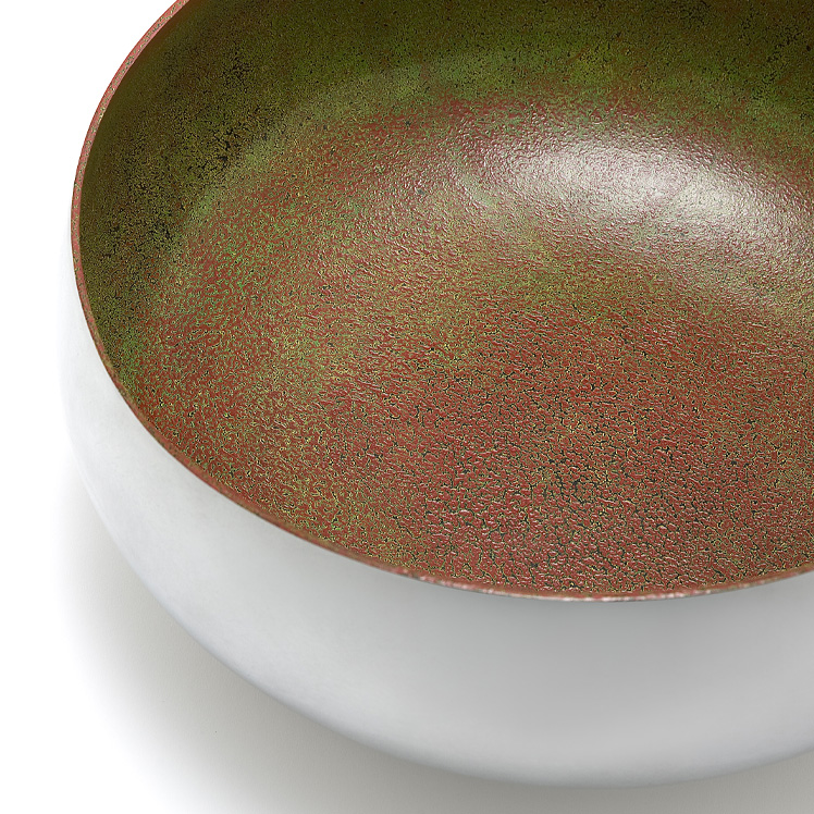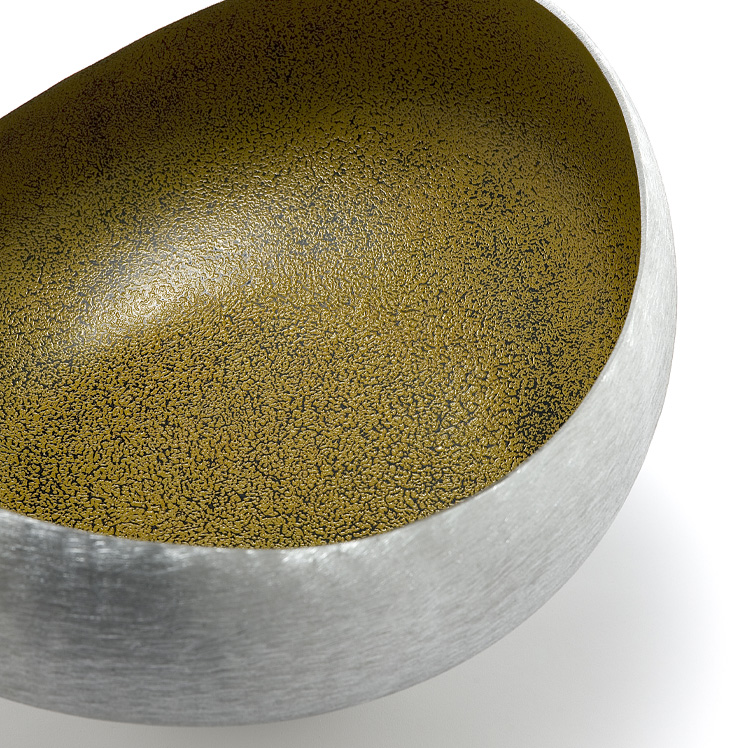 Material contrast plays a central role in his practice. The rigidity of aluminum, shaped through sand casting, enters into dialogue with the depth, warmth, and flexibility of traditional lacquer. Jung further complicates this relationship through the use of Gyochil (絞漆), a technique that introduces layered textures and tactile irregularities, visually evoking the relationship between a seed’s outer shell and its inner core. An experimental use of tofu as a thickening agent reinterprets traditional lacquer processes, generating unexpected surface qualities and chromatic nuance.