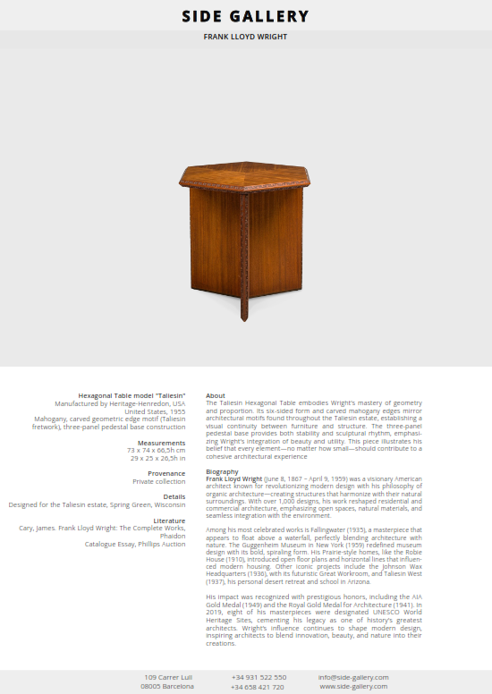 The Taliesin Hexagonal Table embodies Wright’s mastery of geometry and proportion. Its six-sided form and carved mahogany edges mirror architectural motifs found throughout the Taliesin estate, establishing a visual continuity between furniture and structure. The three-panel pedestal base provides both stability and sculptural rhythm, emphasizing Wright’s integration of beauty and utility. This piece illustrates his belief that every element—no matter how small—should contribute to a cohesive architectural experience.