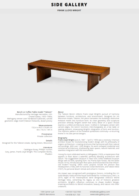 The Taliesin Bench reflects Frank Lloyd Wright’s pursuit of harmony between furniture, architecture, and environment. Designed for his Wisconsin estate, Taliesin, the piece translates the building’s distinctive fretwork motifs into furniture form. Its clean geometry and sculptural precision embody Wright’s belief that every detail of a space should express a unified architectural vision. Crafted in mahogany veneer with carved edges, the bench functions interchangeably as a low table or seating element, showcasing Wright’s integration of form and function. The rhythmic pattern of the fretwork symbolizes continuity—a recurring theme in his late-period designs.