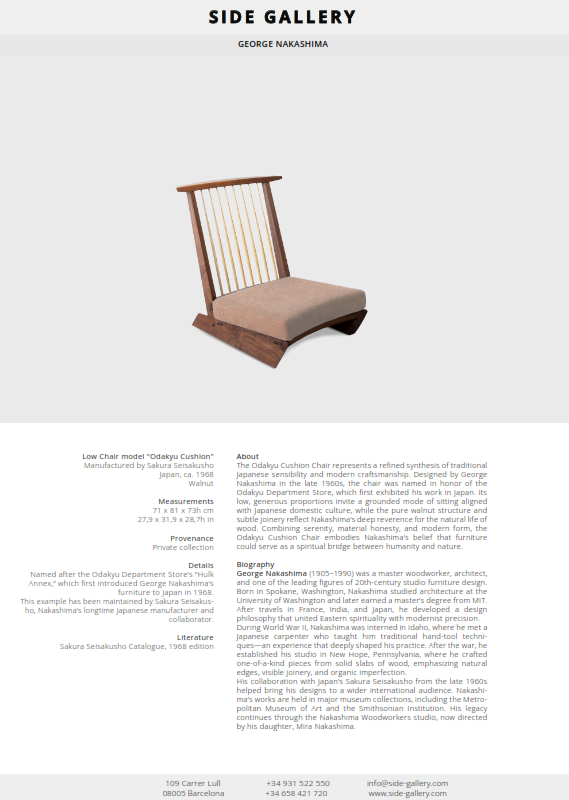 The Odakyu Cushion Chair represents a refined synthesis of traditional Japanese sensibility and modern craftsmanship. Designed by George Nakashima in the late 1960s, the chair was named in honor of the Odakyu Department Store, which first exhibited his work in Japan. Its low, generous proportions invite a grounded mode of sitting aligned with Japanese domestic culture, while the pure walnut structure and subtle joinery reflect Nakashima’s deep reverence for the natural life of wood. Combining serenity, material honesty, and modern form, the Odakyu Cushion Chair embodies Nakashima’s belief that furniture could serve as a spiritual bridge between humanity and nature.