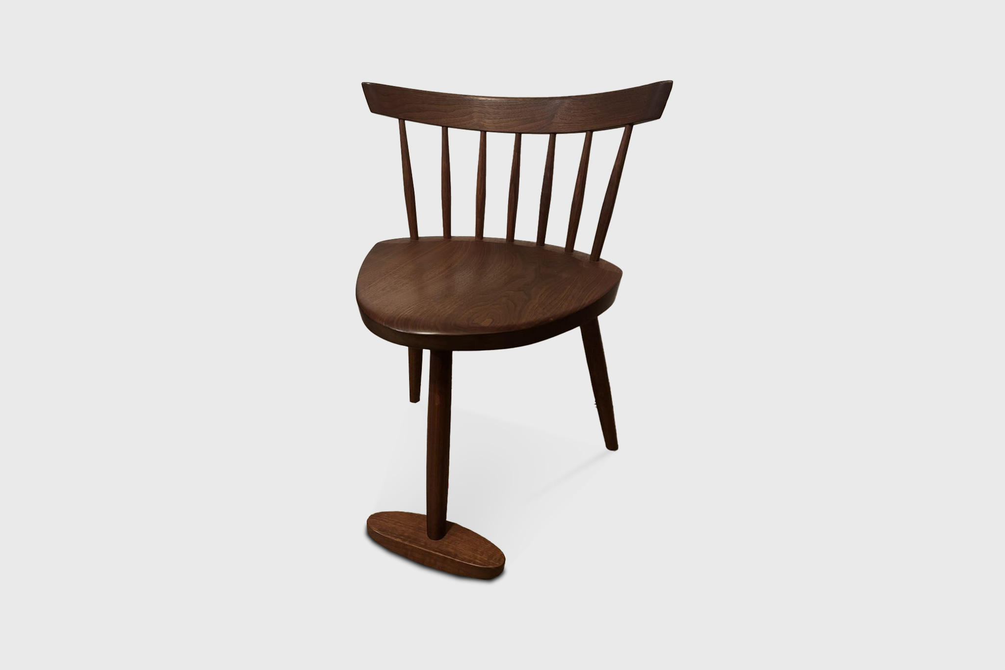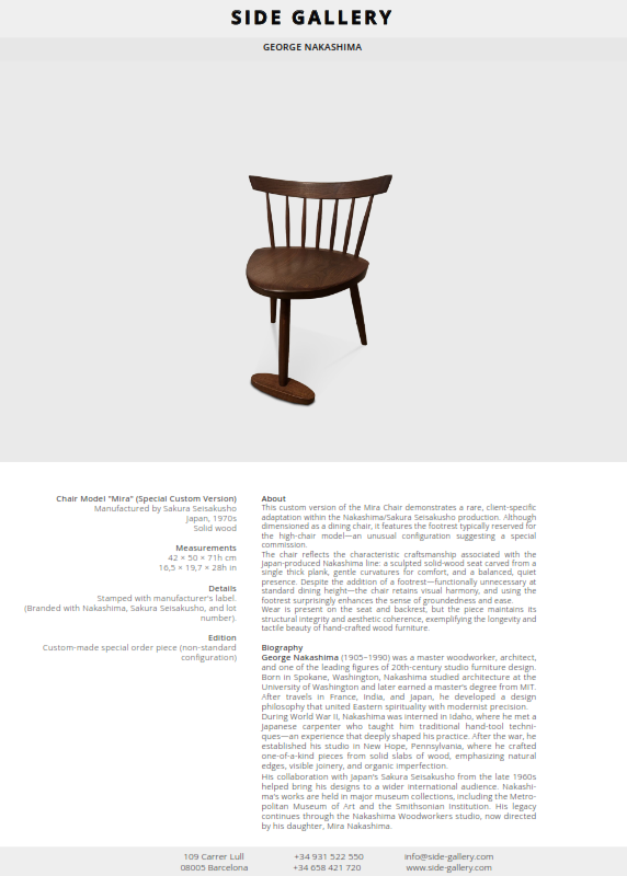This custom version of the Mira Chair demonstrates a rare, client-specific adaptation within the Nakashima/Sakura Seisakusho production. Although dimensioned as a dining chair, it features the footrest typically reserved for the high-chair model—an unusual configuration suggesting a special commission.