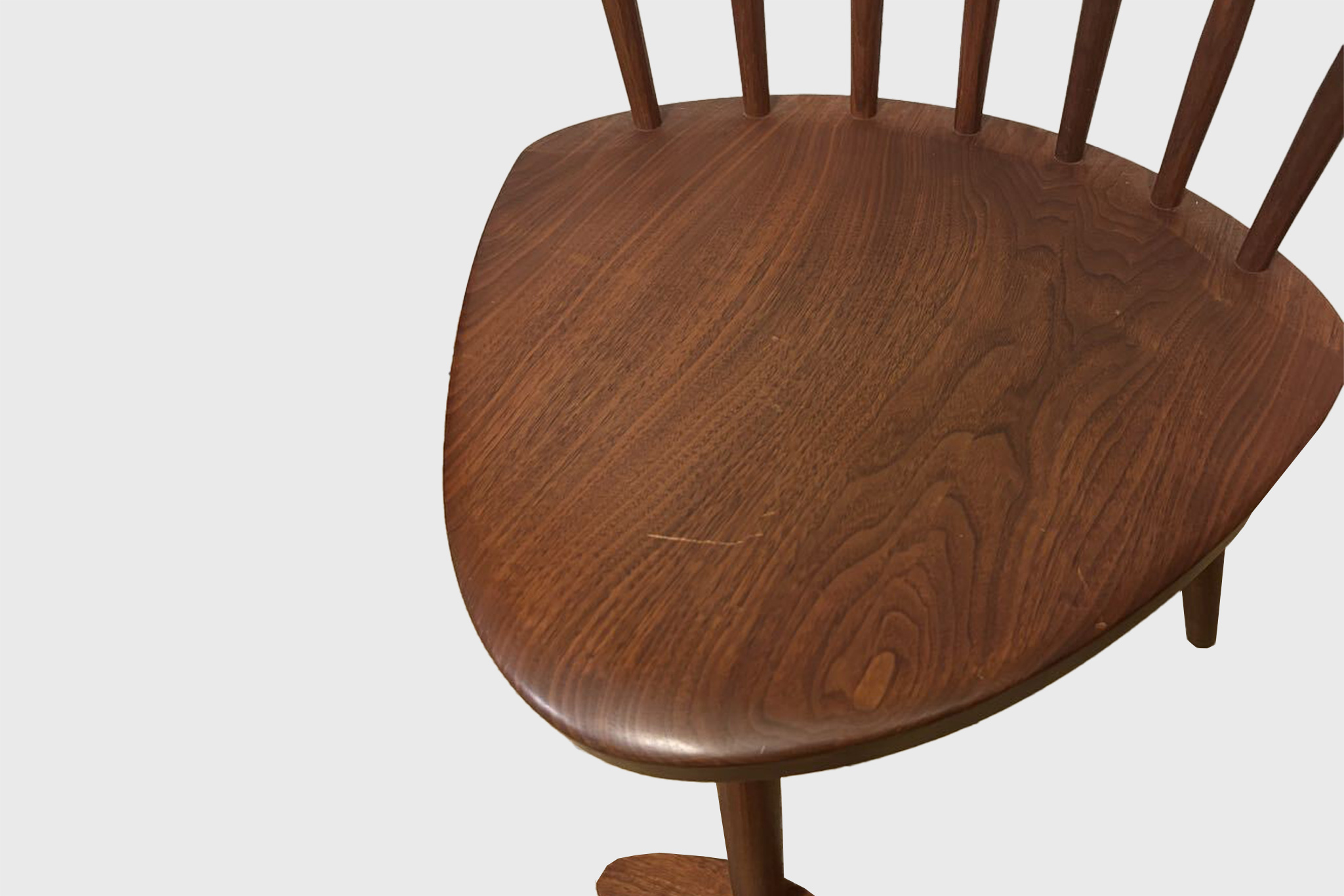 The chair reflects the characteristic craftsmanship associated with the Japan-produced Nakashima line: a sculpted solid-wood seat carved from a single thick plank, gentle curvatures for comfort, and a balanced, quiet presence. Despite the addition of a footrest—functionally unnecessary at standard dining height—the chair retains visual harmony, and using the footrest surprisingly enhances the sense of groundedness and ease.
