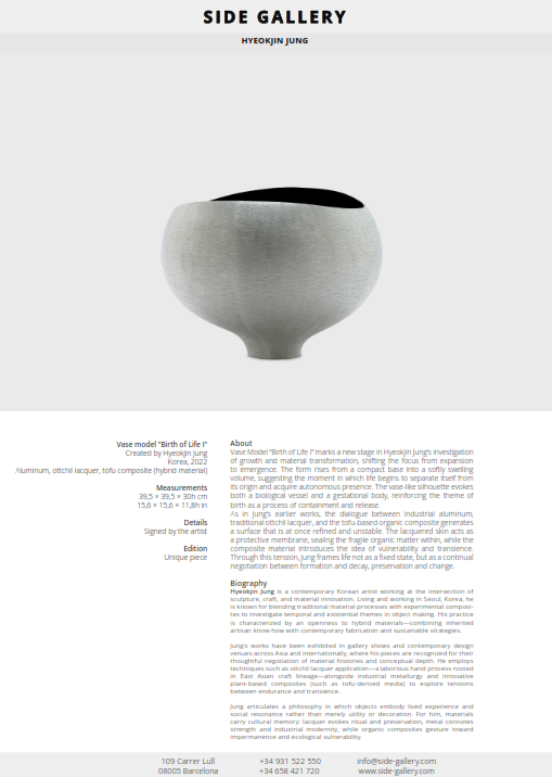 Vase Model "Birth of Life I" marks a new stage in Hyeokjin Jung’s investigation of growth and material transformation, shifting the focus from expansion to emergence. The form rises from a compact base into a softly swelling volume, suggesting the moment in which life begins to separate itself from its origin and acquire autonomous presence. The vase-like silhouette evokes both a biological vessel and a gestational body, reinforcing the theme of birth as a process of containment and release.