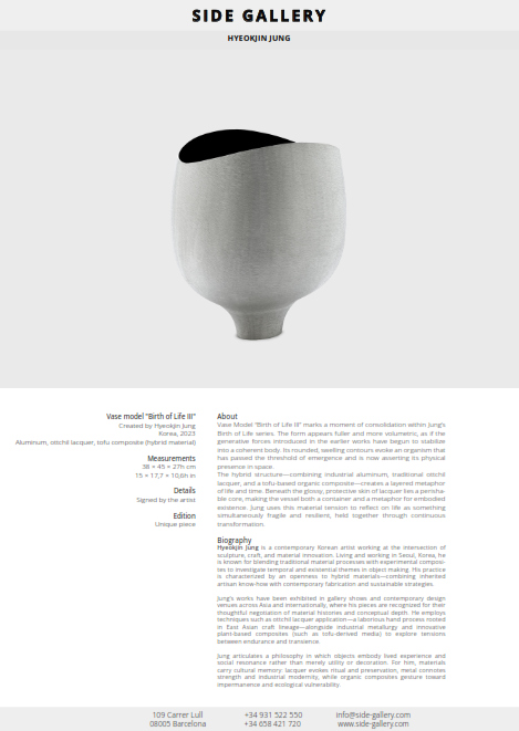 Vase Model "Birth of Life III" marks a moment of consolidation within Jung’s Birth of Life series. The form appears fuller and more volumetric, as if the generative forces introduced in the earlier works have begun to stabilize into a coherent body. Its rounded, swelling contours evoke an organism that has passed the threshold of emergence and is now asserting its physical presence in space.