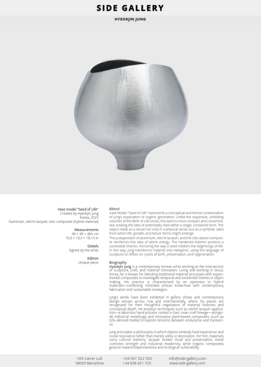 Vase Model "Seed of Life" represents a conceptual and formal condensation of Jung’s exploration of organic generation. Unlike the expansive, unfolding volumes of the Birth of Life series, this work is more compact and concentrated, evoking the idea of potentiality held within a single, contained form. The object reads as a vessel not only in a physical sense, but as a symbolic seed from which life, growth, and future forms might emerge.