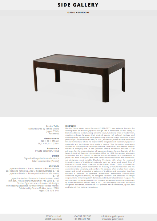 Kenmochi Isamu’s life embodies both the challenges and possibilities of design in postwar Japan. By bridging tradition and modernity, craft and industry, local and global, he helped shape the foundation of Japanese modern design. His ideas, born out of dialogue with both Japanese heritage and international movements, continue to resonate, affirming his place as one of the central figures of twentieth-century design.