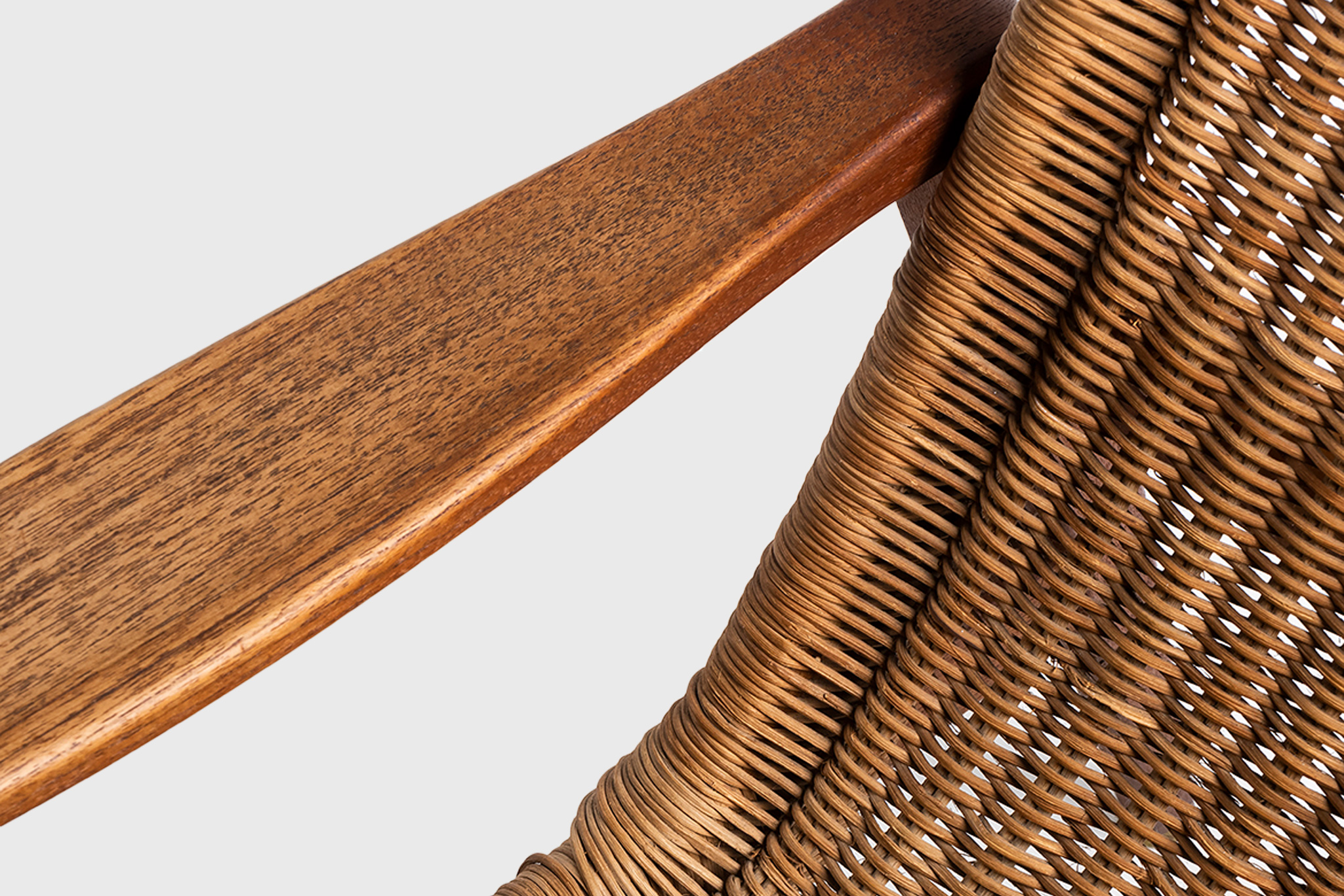 The structure combines a solid wooden frame with woven rattan elements, creating a balanced dialogue between rigidity and flexibility. The generous proportions and enveloping form provide both visual presence and ergonomic support, while the rattan introduces lightness and breathability, softening the architectural character of the wooden construction.