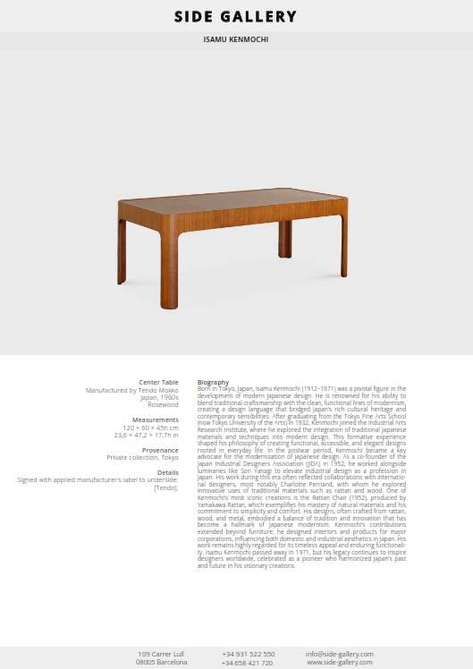Kenmochi Isamu’s life embodies both the challenges and possibilities of design in postwar Japan. By bridging tradition and modernity, craft and industry, local and global, he helped shape the foundation of Japanese modern design. His ideas, born out of dialogue with both Japanese heritage and international movements, continue to resonate, affirming his place as one of the central figures of twentieth-century design.