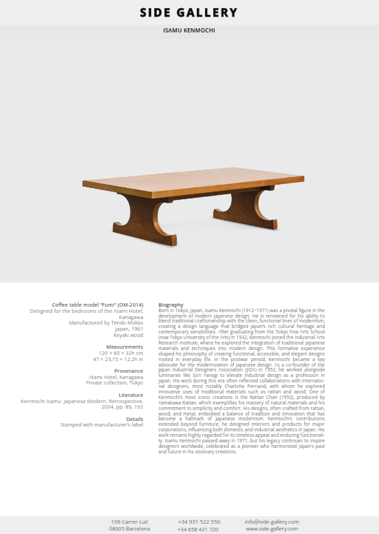 Kenmochi Isamu’s life embodies both the challenges and possibilities of design in postwar Japan. By bridging tradition and modernity, craft and industry, local and global, he helped shape the foundation of Japanese modern design. His ideas, born out of dialogue with both Japanese heritage and international movements, continue to resonate, affirming his place as one of the central figures of twentieth-century design.