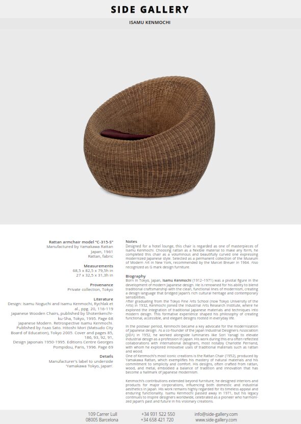 Today, many of Kenmochi’s works are preserved in museum collections, including the Museum of Modern Art (MoMA) in New York. His designs, such as the Rattan Chair, remain timeless examples of how Japanese sensibilities can be expressed in modern form.