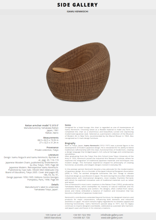 In postwar Japan, Isamu Kenmochi was a pioneer in industrial and decorative design and one of the most internationally renowned Japanese designers. In 1952, he made a study trip to the United States, which he reported on in several articles for the magazine Kogei Nyusu ("Industrial Arts News"). He was the first Japanese to attend the International Design Conference in Aspen in 1953. Keen to give Japanese design a modern identity, Kenmochi studied and adopted foreign manufacturing techniques, but this did not prevent him from taking a great interest in his country's artisanal methods. He apprenticed at the Tokyo Institute of Industrial Arts After graduating in 1932, he enrolled in the Wood Technology Department of the IAI (Institute of Industrial Arts) in Sendai, where, far from urban centers, he drew inspiration from everyday objects made by local artisans (no. 12). Bruno Taut's visit to the IAI in 1934 confirmed Kenmochi's ambition to modernize Japanese interiors and use technology that would reduce production costs. During the war, he studied with the Sendai Wood Technology Department the potential applications of wood-based products (particularly plywood) in aeronautics. This research, like that carried out by Charles Eames for the United States Department of the Navy, paved the way for new uses for these materials after the war. Kenmochi would help found several important design organizations, including the Japan Design Committee (1953) and the Japan Association of interior designers (1956), and would play a major role in creating the Japanese Good Design movement. In 1955, he left the IAI to found the Kenmochi Design Associates agency. He implemented his designs by decorating the Japanese pavilion at Expo 58 in Brussels, which won a major prize. Once at the helm of his own agency, he introduced international industrial design practices, such as the production of full-scale drawings or prototypes, which had been first introduced in Japan by Bruno Taut. Kenmochi's best-known designs date from this period, in which he combined the natural materials of traditional Japanese craftsmanship with modern forms and mass production techniques. He became a professor at Tama Art University in Tokyo in 1959.