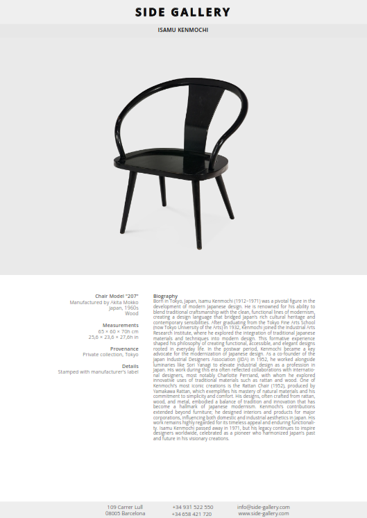 In postwar Japan, Isamu Kenmochi was a pioneer in industrial and decorative design and one of the most internationally renowned Japanese designers. In 1952, he made a study trip to the United States, which he reported on in several articles for the magazine Kogei Nyusu ("Industrial Arts News"). He was the first Japanese to attend the International Design Conference in Aspen in 1953. Keen to give Japanese design a modern identity, Kenmochi studied and adopted foreign manufacturing techniques, but this did not prevent him from taking a great interest in his country's artisanal methods. He apprenticed at the Tokyo Institute of Industrial Arts After graduating in 1932, he enrolled in the Wood Technology Department of the IAI (Institute of Industrial Arts) in Sendai, where, far from urban centers, he drew inspiration from everyday objects made by local artisans (no. 12). Bruno Taut's visit to the IAI in 1934 confirmed Kenmochi's ambition to modernize Japanese interiors and use technology that would reduce production costs. During the war, he studied with the Sendai Wood Technology Department the potential applications of wood-based products (particularly plywood) in aeronautics. This research, like that carried out by Charles Eames for the United States Department of the Navy, paved the way for new uses for these materials after the war. Kenmochi would help found several important design organizations, including the Japan Design Committee (1953) and the Japan Association of interior designers (1956), and would play a major role in creating the Japanese Good Design movement. In 1955, he left the IAI to found the Kenmochi Design Associates agency. He implemented his designs by decorating the Japanese pavilion at Expo 58 in Brussels, which won a major prize. Once at the helm of his own agency, he introduced international industrial design practices, such as the production of full-scale drawings or prototypes, which had been first introduced in Japan by Bruno Taut. Kenmochi's best-known designs date from this period, in which he combined the natural materials of traditional Japanese craftsmanship with modern forms and mass production techniques. He became a professor at Tama Art University in Tokyo in 1959.