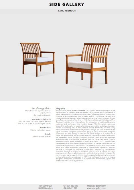 The chairs exemplify this vision through their elegantly bent oak frames and refined proportions, combining advanced woodworking techniques with a tactile, humanistic sensibility. Their sculptural yet restrained form places them among the most accomplished expressions of postwar Japanese furniture design, embodying both technical mastery and poetic simplicity.