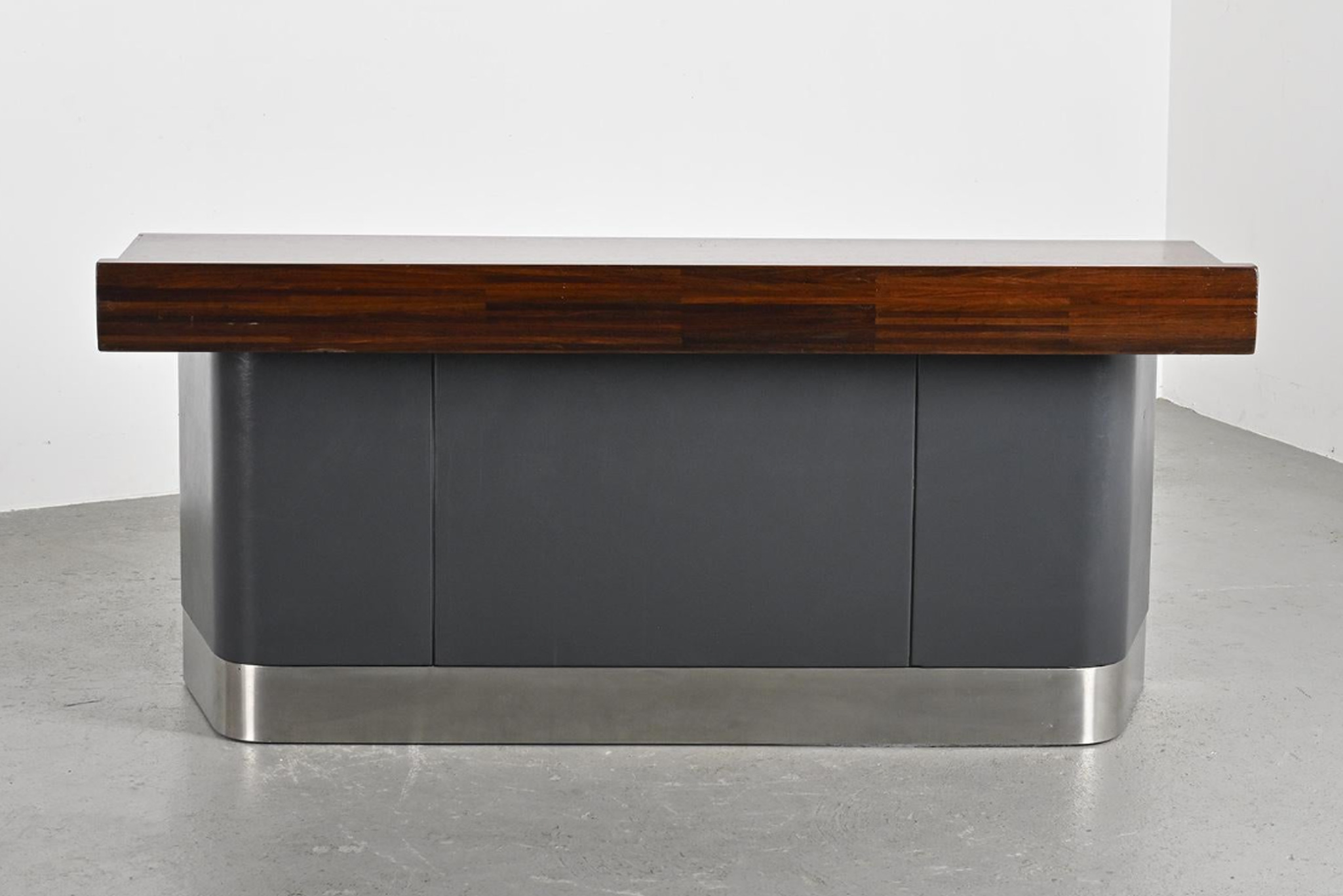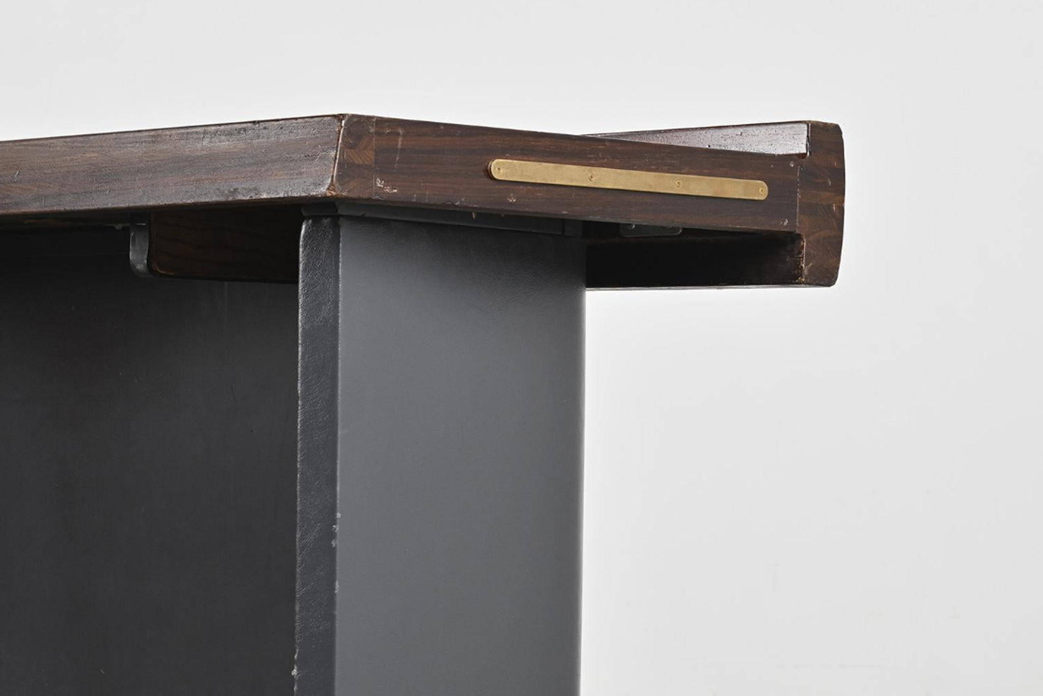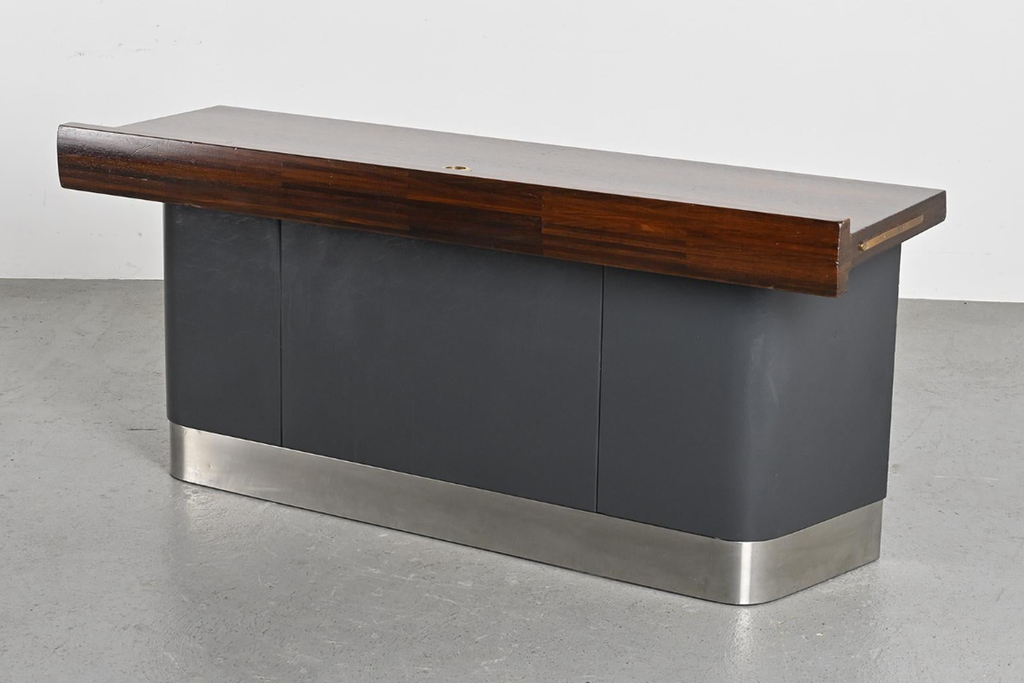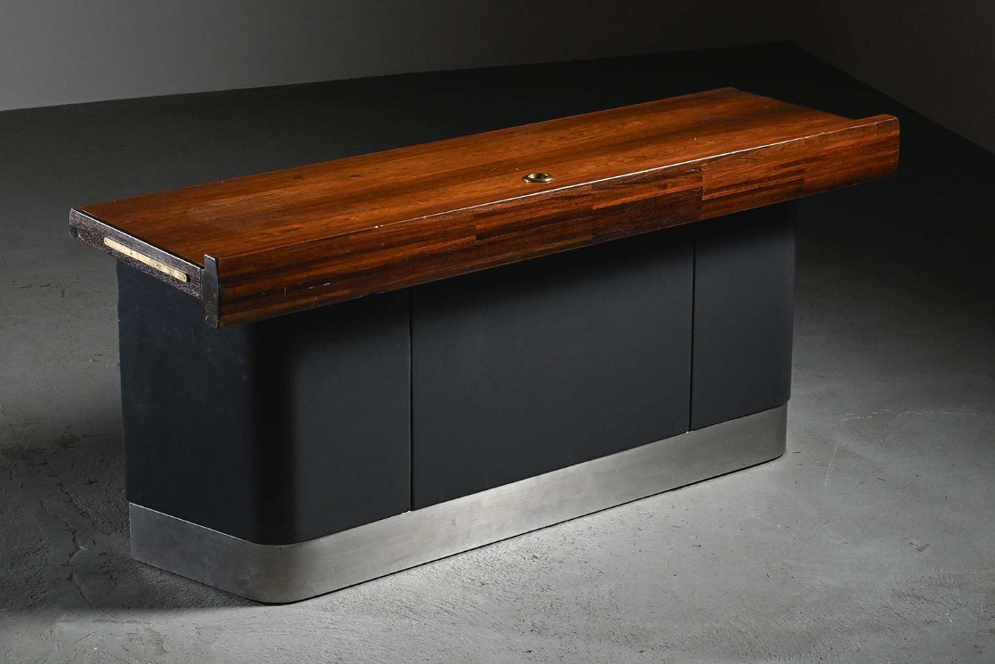 Produced by Tendo Mokko in 1966, the desk exemplifies the synthesis of architectural rigor and material refinement that defined Kenmochi’s mature work. The structure consists of a wooden base clad in grey leather, grounded by a stainless steel plinth that introduces a precise horizontal accent. The substantial rosewood top, finely profiled along its edges, provides visual weight and tactile richness, balancing monumentality with disciplined restraint.