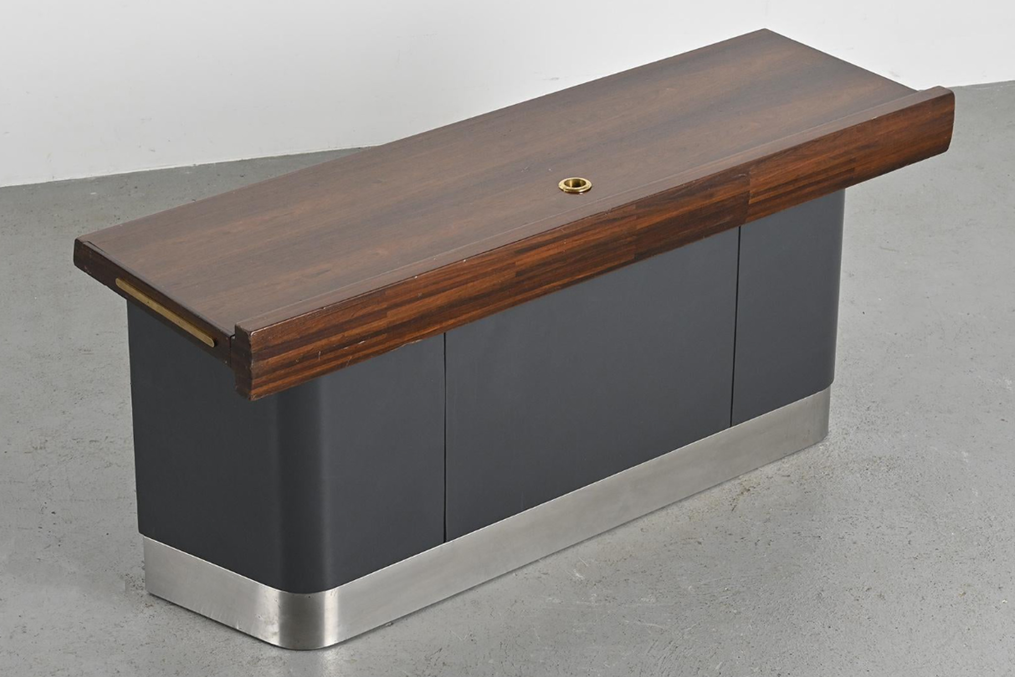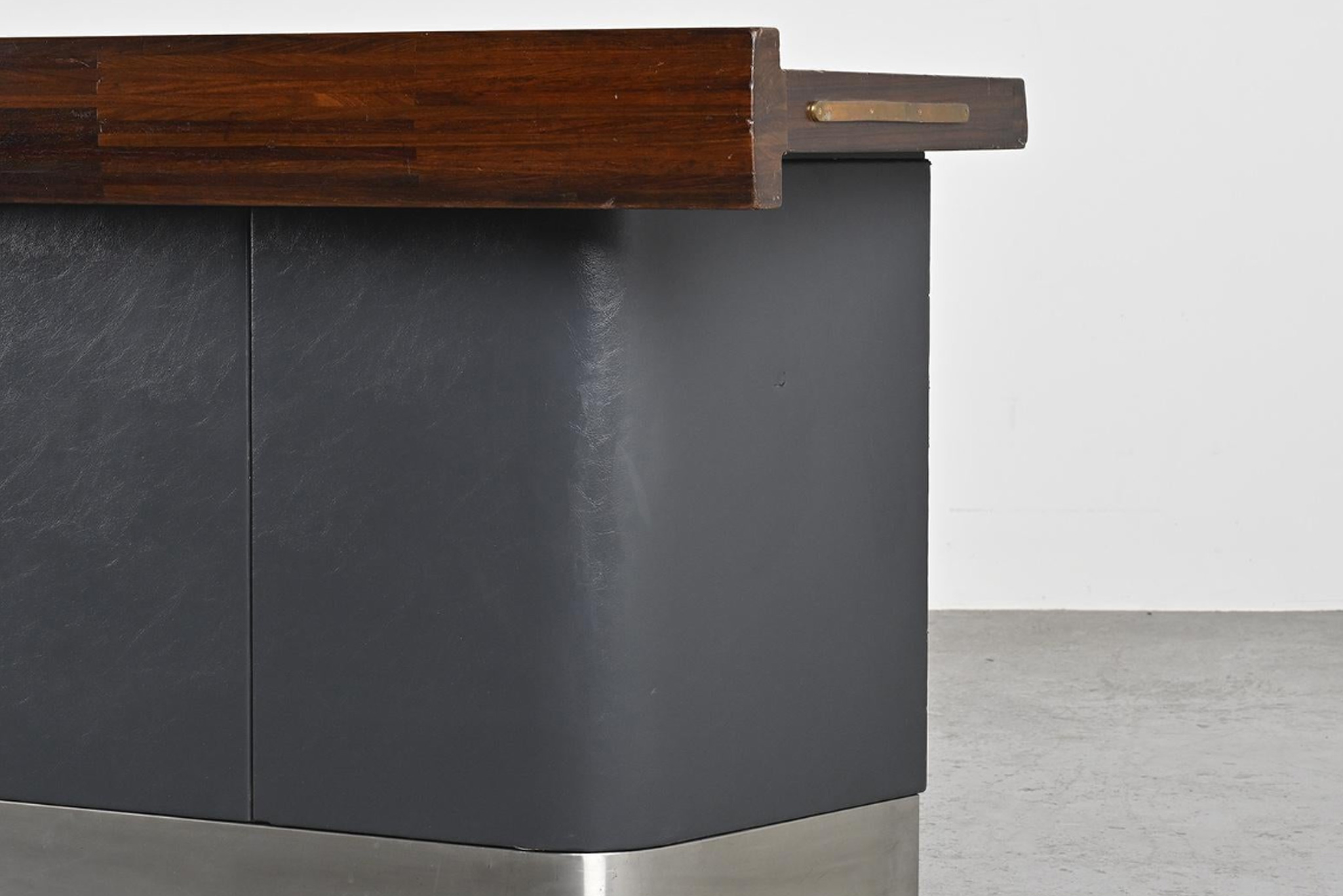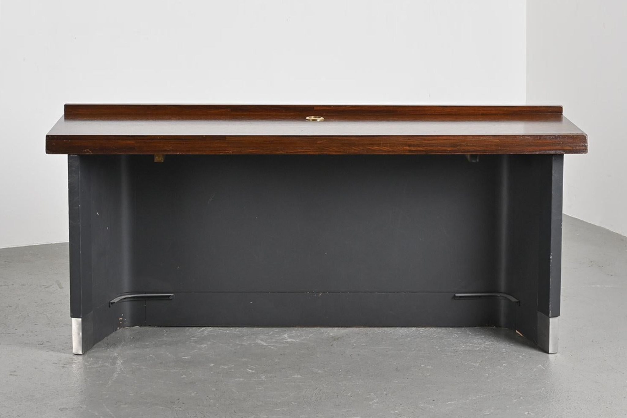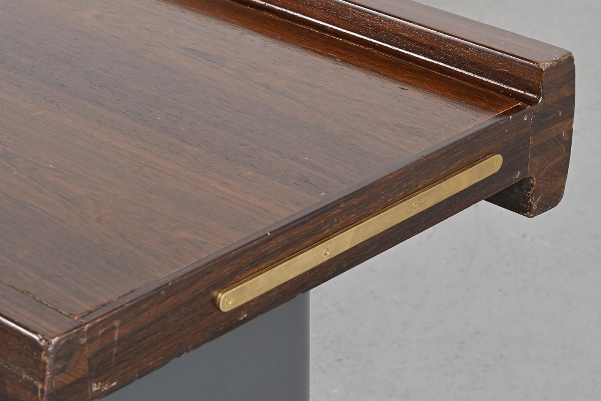Produced by Tendo Mokko in 1966, the desk exemplifies the synthesis of architectural rigor and material refinement that defined Kenmochi’s mature work. The structure consists of a wooden base clad in grey leather, grounded by a stainless steel plinth that introduces a precise horizontal accent. The substantial rosewood top, finely profiled along its edges, provides visual weight and tactile richness, balancing monumentality with disciplined restraint.