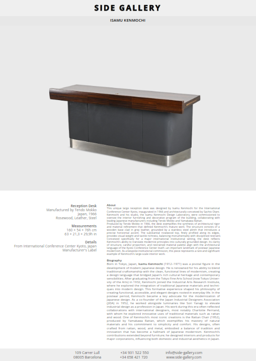 Conceived specifically for a major international institutional setting, the desk reflects Kenmochi’s ability to translate modernist principles into culturally grounded design. Its clarity of structure, careful proportion, and restrained material palette align with the architectural language of the Kyoto Conference Center itself—an important landmark of postwar Japanese modernism. As a bespoke institutional commission, this piece represents a rare and significant example of Kenmochi’s large-scale interior work.