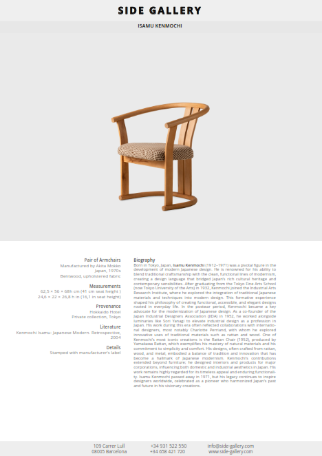 Akita Mokko, renowned for its bentwood craftsmanship, provided the technical foundation for this design, enabling Kenmochi to explore continuity of line and structural lightness while maintaining durability and comfort. These chairs represent the mature phase of Kenmochi’s modernist vocabulary.