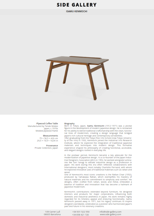 Born in 1912 in Tokyo, Japan, Isamu Kenmochi 剣持勇 was one of Japan's leading interior and product designers, and one of the pioneers who laid the foundations for the design trend known as Japanese Modern. From the chaotic postwar period through the years of rapid economic growth, Kenmochi was deeply involved in Japan's industrial design and the development of living environments. He expanded his activities beyond furniture design to include exhibition design, showroom production, and even the creation of educational systems for design, pursuing a “comprehensive design” aimed at improving the quality of living spaces as a whole.