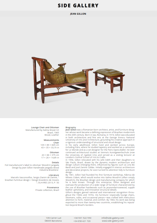 In addition to furniture, Gillon was a prolific creator in other disciplines, including tapestry, sculpture, painting, and architectural interiors, and participated in numerous exhibitions both in Brazil and internationally, reflecting his multifaceted artistic practice. After a long and influential career, Gillon retired in 2003 and passed away in São Paulo in 2007. His work continues to be celebrated in museum collections, design exhibitions, and among global collectors of mid‑century modern design.