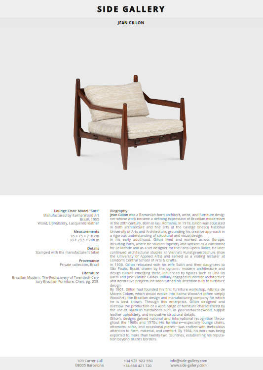 In addition to furniture, Gillon was a prolific creator in other disciplines, including tapestry, sculpture, painting, and architectural interiors, and participated in numerous exhibitions both in Brazil and internationally, reflecting his multifaceted artistic practice. After a long and influential career, Gillon retired in 2003 and passed away in São Paulo in 2007. His work continues to be celebrated in museum collections, design exhibitions, and among global collectors of mid‑century modern design.