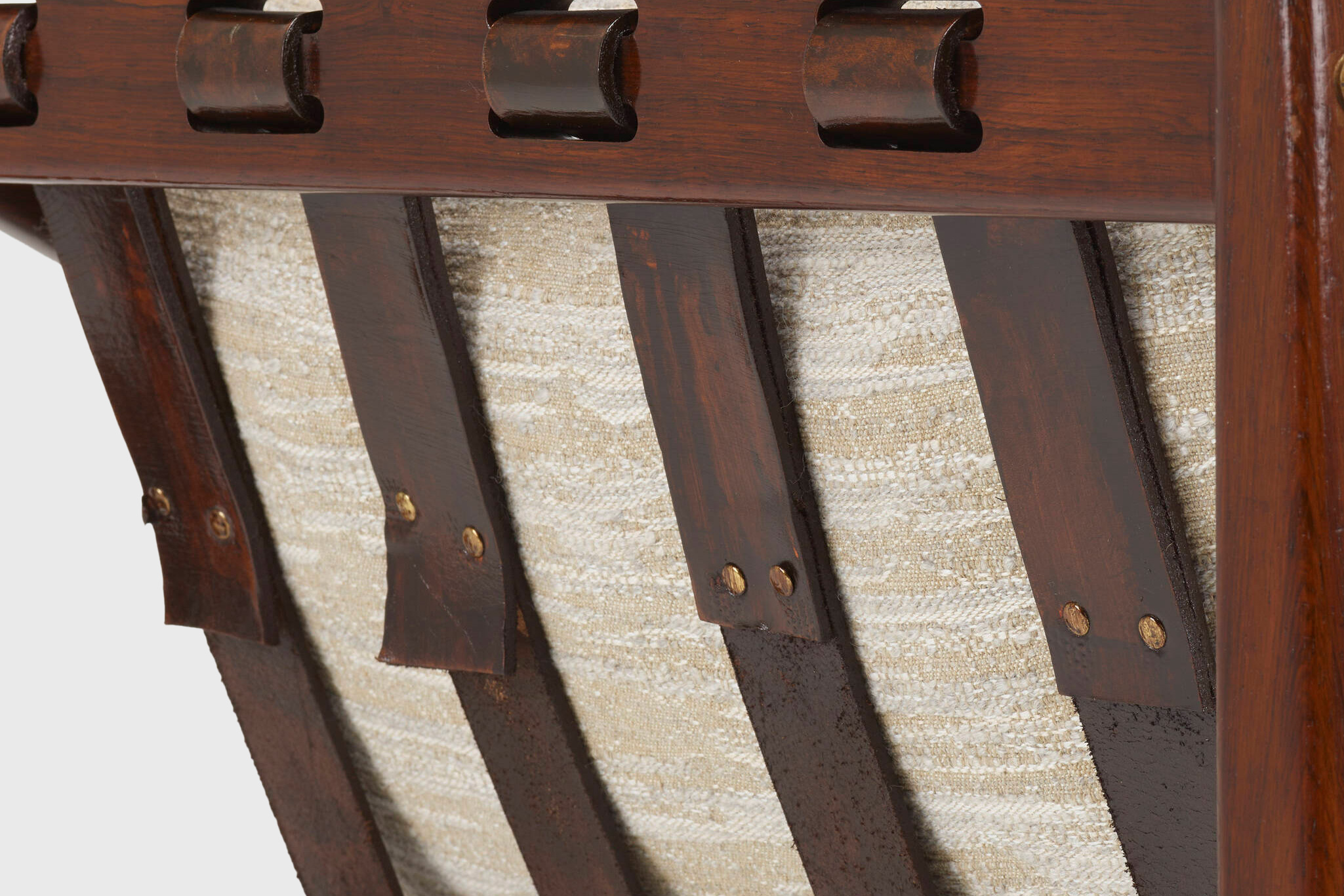 Among his most iconic designs is the Jangada Chair (1968) and its matching ottoman—a lounge chair featuring a frame of richly grained Brazilian hardwood, leather upholstery, and a support system of knotted nylon netting evocative of traditional Brazilian fishing rafts (jangadas). This piece became emblematic of Gillon’s ability to blend organic form, technical innovation, and cultural reference. For its originality and design excellence, the Jangada earned distinctions such as recognition from the Brazilian furniture association MOVESP in 1991.