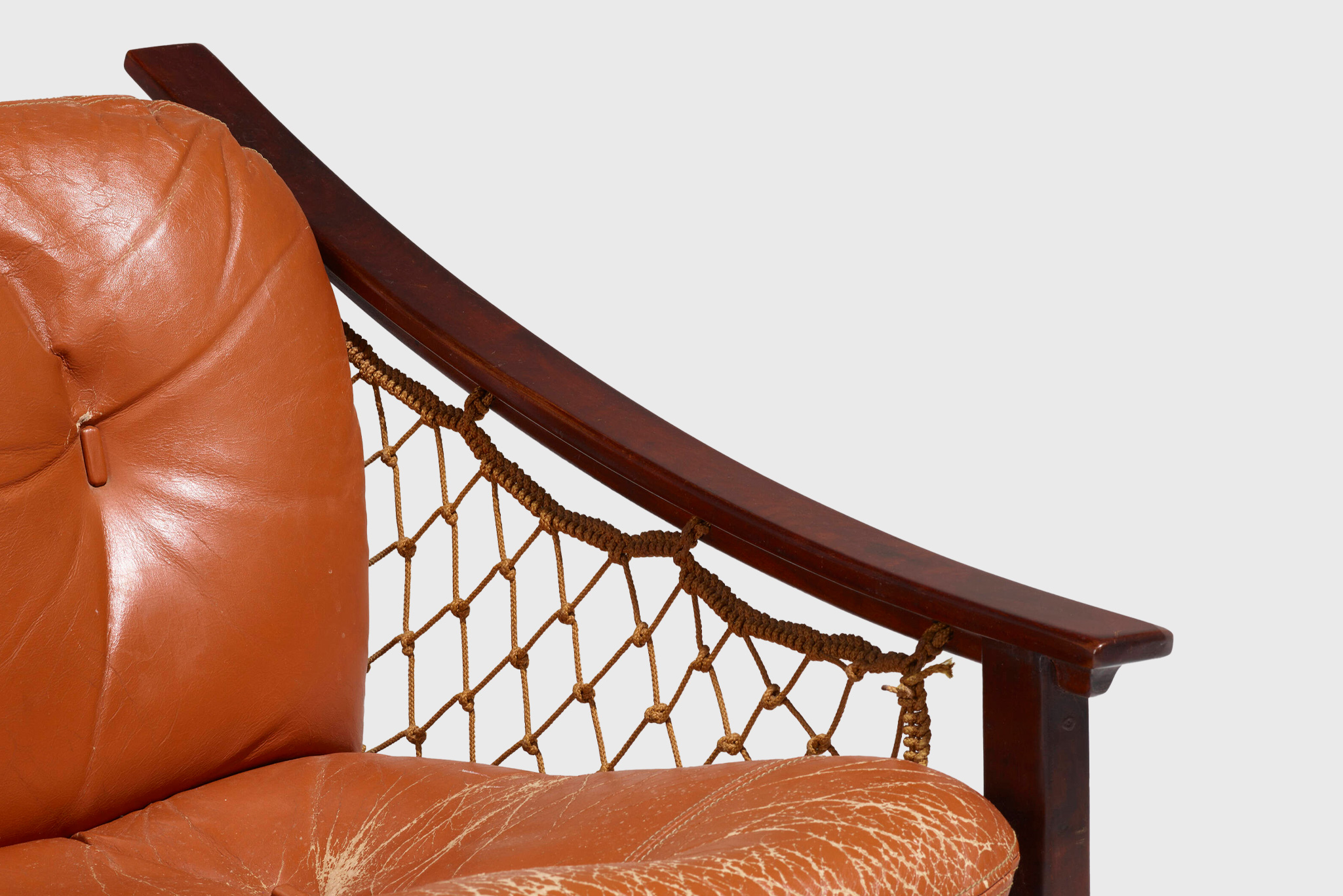 Among his most iconic designs is the Jangada Chair (1968) and its matching ottoman—a lounge chair featuring a frame of richly grained Brazilian hardwood, leather upholstery, and a support system of knotted nylon netting evocative of traditional Brazilian fishing rafts (jangadas). This piece became emblematic of Gillon’s ability to blend organic form, technical innovation, and cultural reference. For its originality and design excellence, the Jangada earned distinctions such as recognition from the Brazilian furniture association MOVESP in 1991.