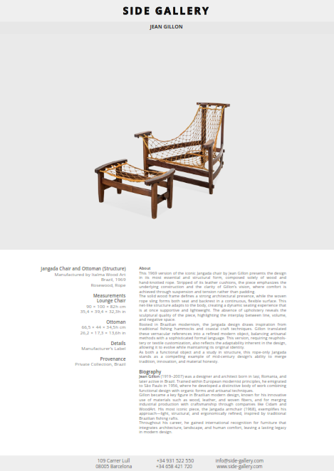 Rooted in Brazilian modernism, the Jangada design draws inspiration from traditional fishing hammocks and coastal craft techniques. Gillon translated these vernacular references into a refined modern object, balancing artisanal methods with a sophisticated formal language. This version, requiring reupholstery or textile customization, also reflects the adaptability inherent in the design, allowing it to evolve while maintaining its original identity.