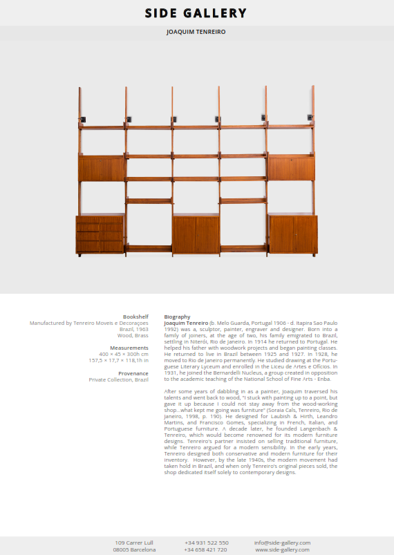 After some years of dabbling in as a painter, Joaquim traversed his talents and went back to wood, "I stuck with painting up to a point, but gave it up because I could not stay away from the wood-working shop...what kept me going was furniture" (Soraia Cals, Tenreiro, Rio de Janeiro, 1998, p. 190). He designed for Laubish & Hirth, Leandro Martins, and Francisco Gomes, specializing in French, Italian, and Portuguese furniture. A decade later, he founded Langenbach & Tenreiro, which would become renowned for its modern furniture designs. Tenreiro's partner insisted on selling traditional furniture, while Tenreiro argued for a modern sensibility. In the early years, Tenreiro designed both conservative and modern furniture for their inventory.  However, by the late 1940s, the modern movement had taken hold in Brazil, and when only Tenreiro's original pieces sold, the shop dedicated itself solely to contemporary designs.