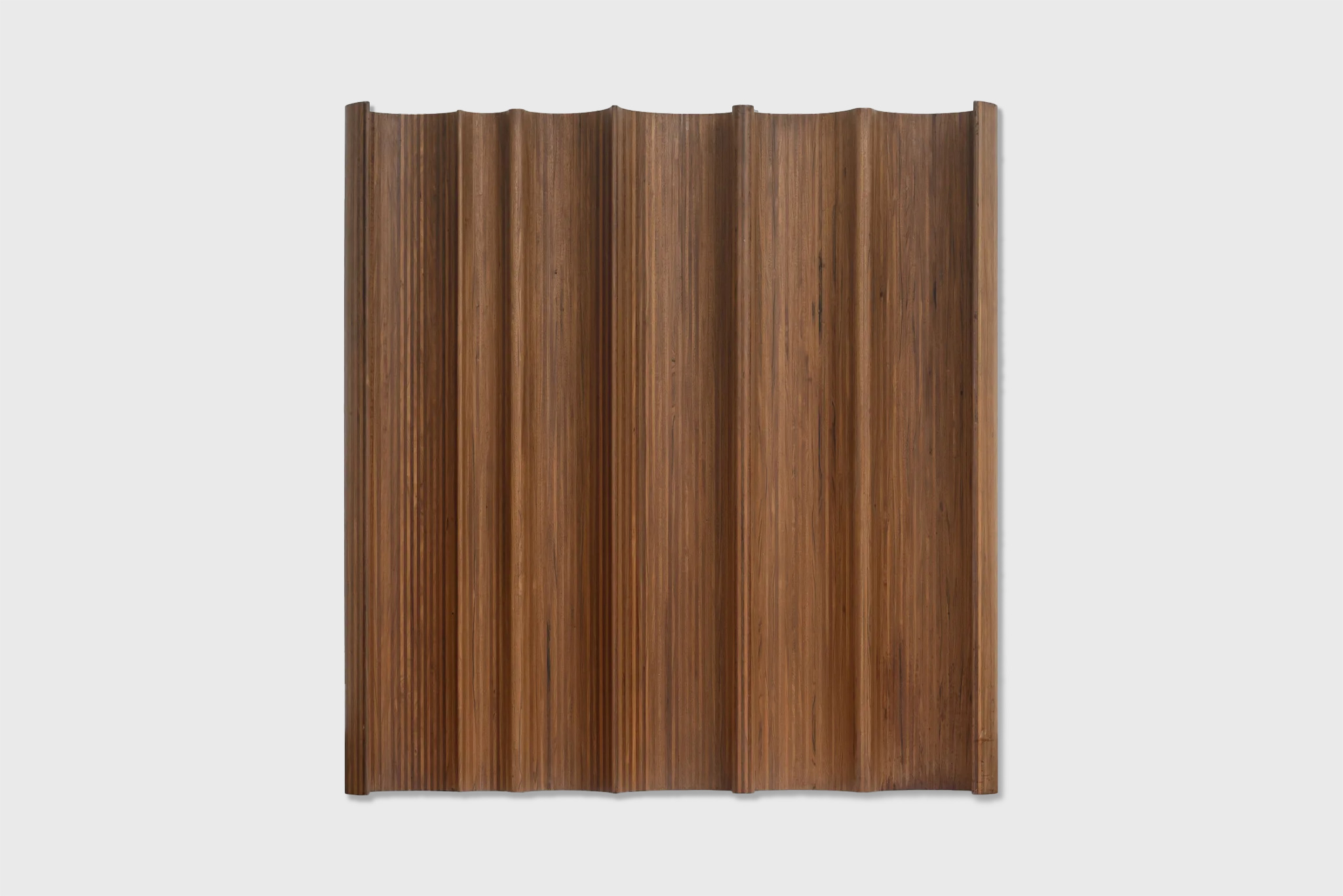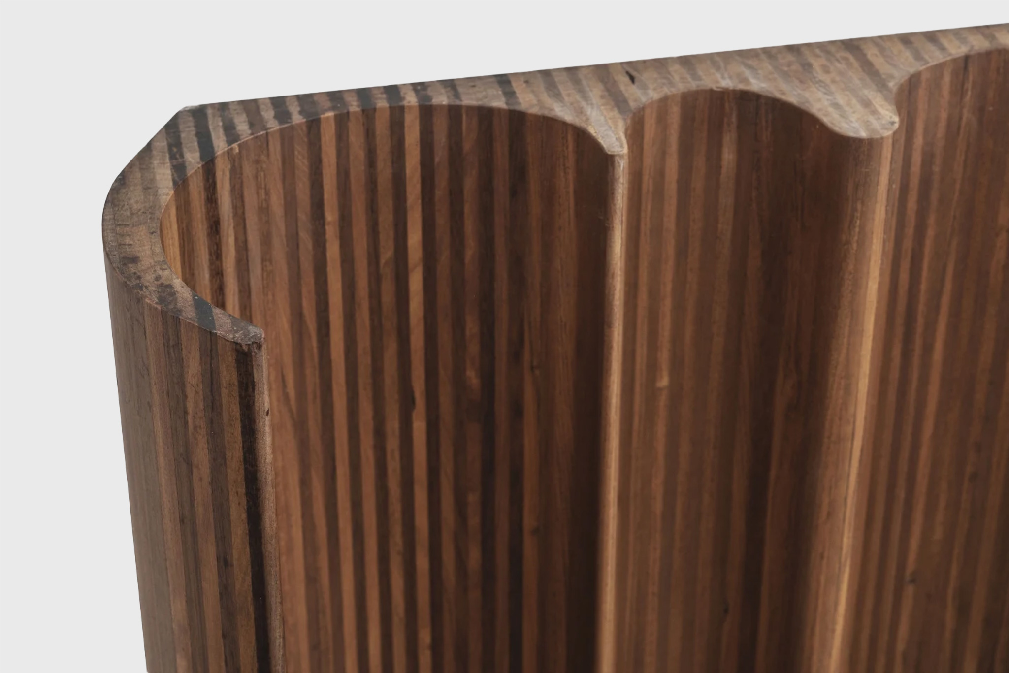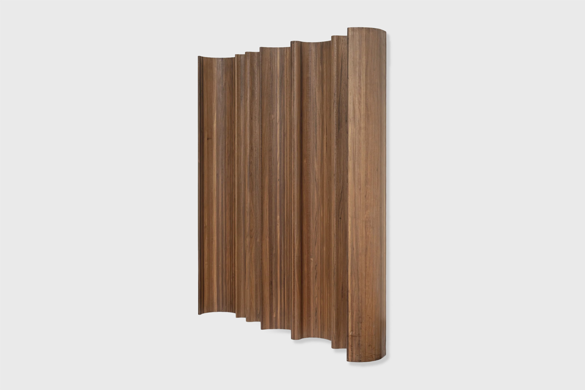 This untitled wood sculpture by Joaquim Tenreiro features a rhythmic arrangement of undulating vertical planes, carved with architectural precision. The relief-like composition creates a dynamic interplay of shadow and depth, articulating a sculptural language that transcends decoration and enters the realm of pure form.
