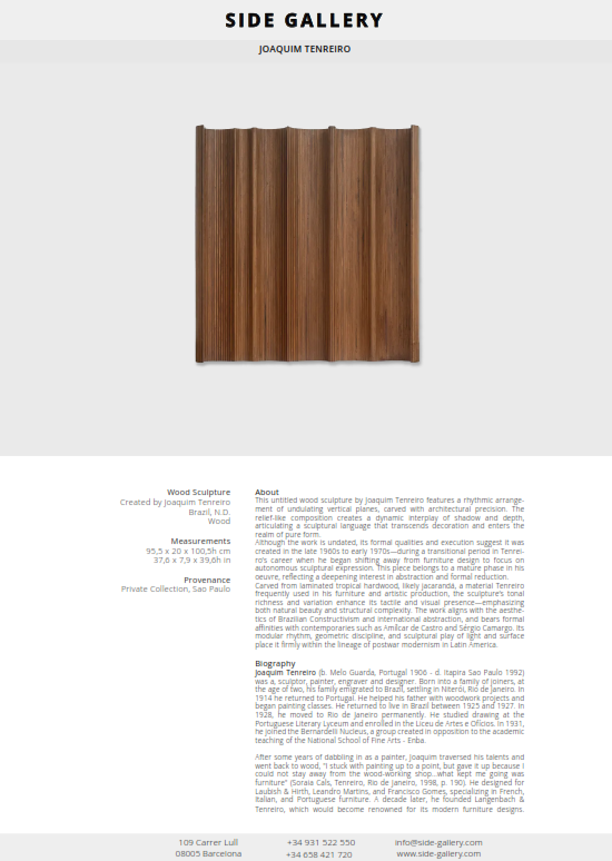 Carved from laminated tropical hardwood, likely jacarandá, a material Tenreiro frequently used in his furniture and artistic production, the sculpture’s tonal richness and variation enhance its tactile and visual presence—emphasizing both natural beauty and structural complexity. The work aligns with the aesthetics of Brazilian Constructivism and international abstraction, and bears formal affinities with contemporaries such as Amílcar de Castro and Sérgio Camargo. Its modular rhythm, geometric discipline, and sculptural play of light and surface place it firmly within the lineage of postwar modernism in Latin America.