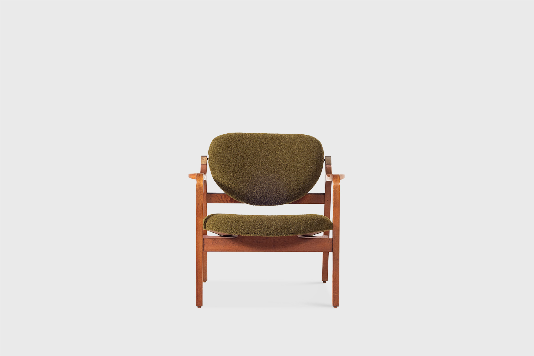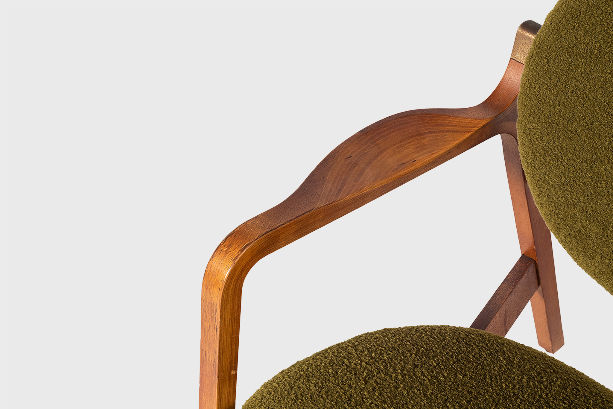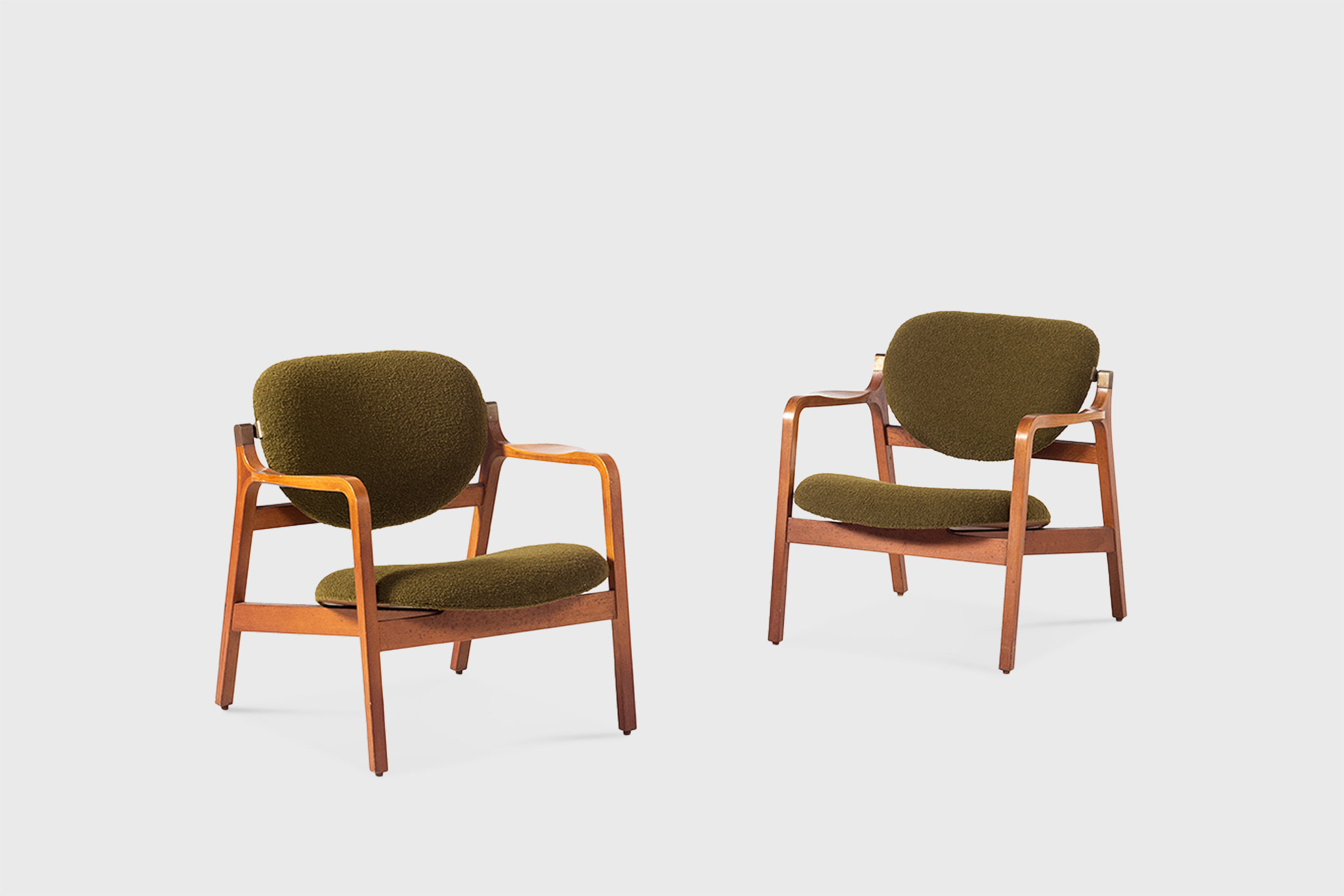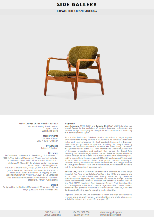 The chairs reflect the synthesis of European modernist principles with Japanese craftsmanship. Their gently curved wooden frames, tactile upholstery and balanced proportions echo the design language that emerged from this collaborative moment.