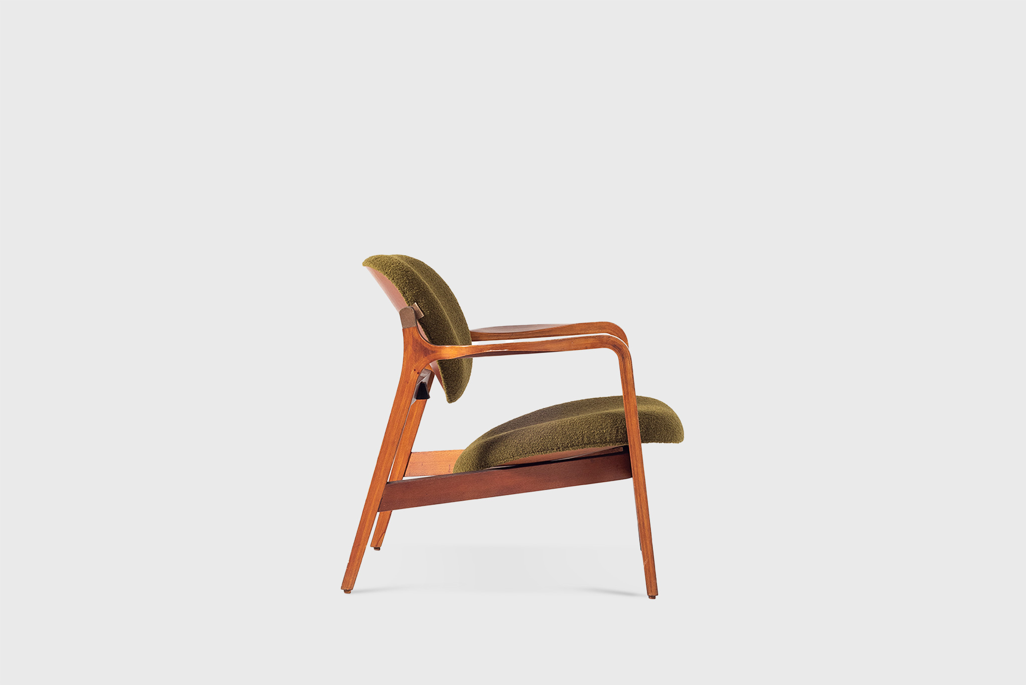 He continued refining his ideas through the 1950s and 60s. Among his most admired works is the Lounge Chair, Model 5016 (1957), produced by Tendō Mokko. With its gently curved plywood frame, upholstered seat, and low, inviting stance, the chair balances comfort with understated elegance. It became a quiet classic of Japanese modern furniture.
