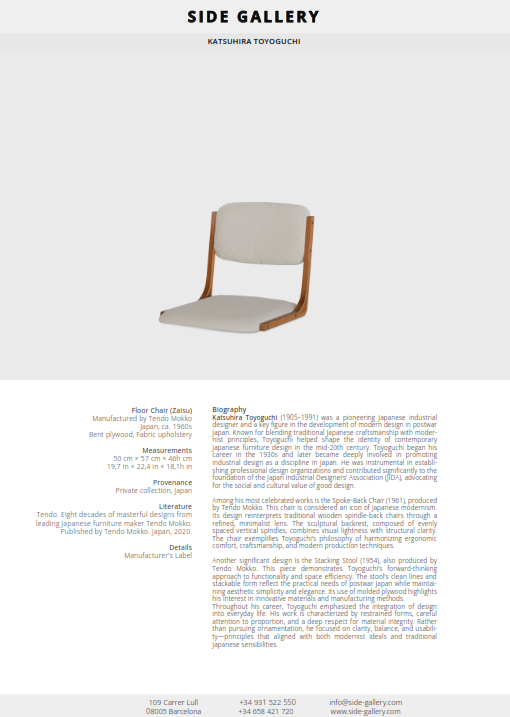 Katsuhira Toyoguchi (1905–1991) was a pioneering Japanese industrial designer and a key figure in the development of modern design in postwar Japan. Known for blending traditional Japanese craftsmanship with modernist principles, Toyoguchi helped shape the identity of contemporary Japanese furniture design in the mid-20th century.