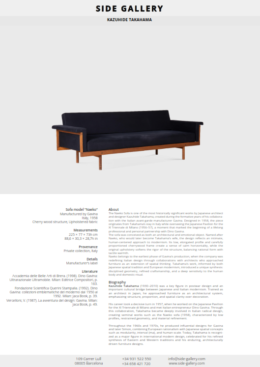 Through Gavina, Takahama entered the radical world of Italian design, where furniture was no longer conceived as a purely functional object but as an intellectual and artistic proposition. Unlike many designers working in Italy at the time, Takahama approached furniture as an architectural system: volumes, voids, surfaces, and proportions were treated with the same seriousness as in building design. His early works for Gavina, including the Naeko sofa (1958), reveal this approach. They are characterized by low, horizontal compositions, carefully calibrated structural frames, and a quiet, contemplative presence that reflects both Japanese domestic culture and European rationalism.