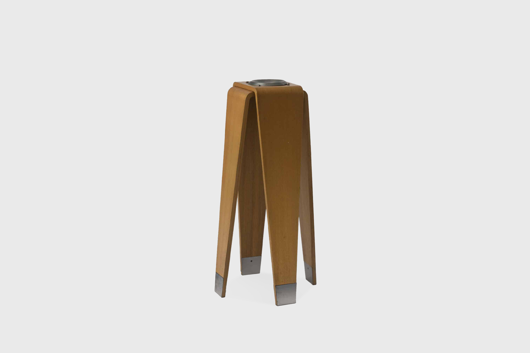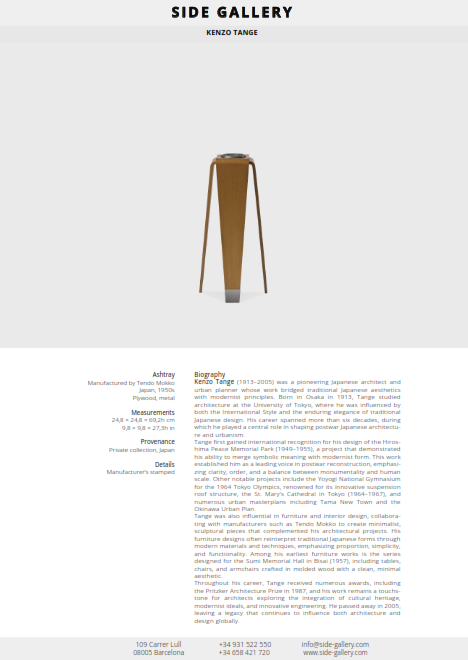 Tange was also influential in furniture and interior design, collaborating with manufacturers such as Tendo Mokko to create minimalist, sculptural pieces that complemented his architectural projects. His furniture designs often reinterpret traditional Japanese forms through modern materials and techniques, emphasizing proportion, simplicity, and functionality. Among his earliest furniture works is the series designed for the Sumi Memorial Hall in Bisai (1957), including tables, chairs, and armchairs crafted in molded wood with a clean, minimal aesthetic.