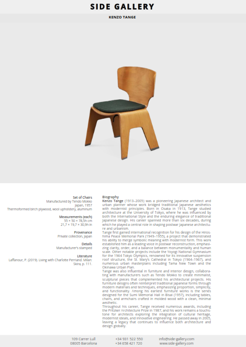 Tange was also influential in furniture and interior design, collaborating with manufacturers such as Tendo Mokko to create minimalist, sculptural pieces that complemented his architectural projects. His furniture designs often reinterpret traditional Japanese forms through modern materials and techniques, emphasizing proportion, simplicity, and functionality. Among his earliest furniture works is the series designed for the Sumi Memorial Hall in Bisai (1957), including tables, chairs, and armchairs crafted in molded wood with a clean, minimal aesthetic.