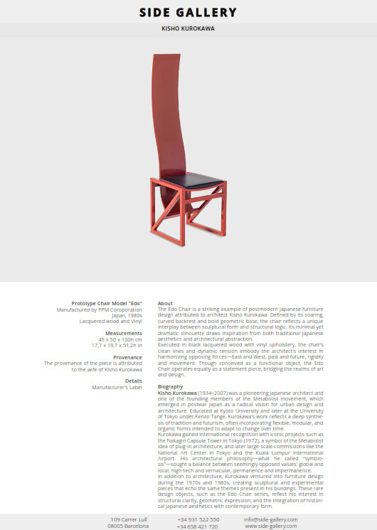 In addition to architecture, Kurokawa ventured into furniture design during the 1970s and 1980s, creating sculptural and experimental pieces that echo the same themes present in his buildings. These rare design objects, such as the Edo Chair series, reflect his interest in structural clarity, geometric expression, and the integration of historical Japanese aesthetics with contemporary form.