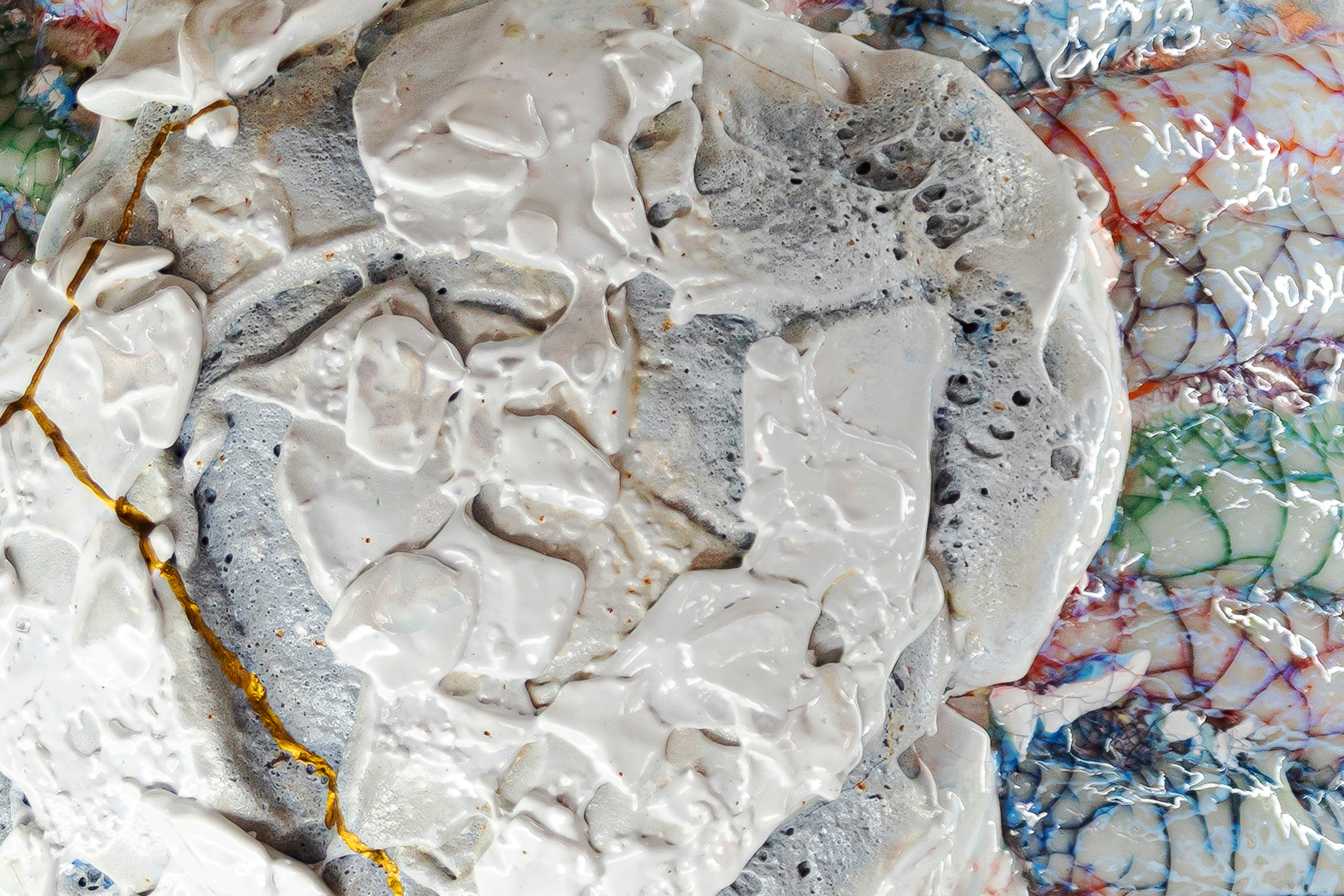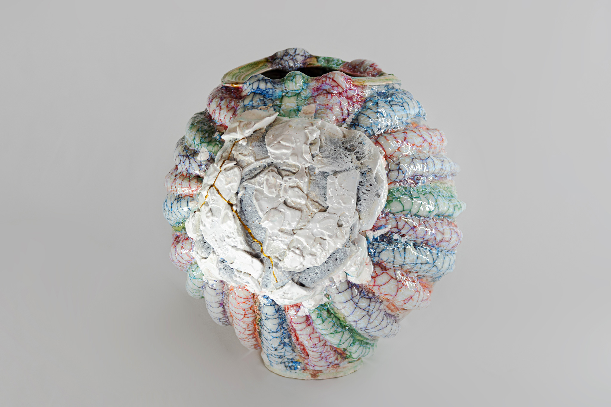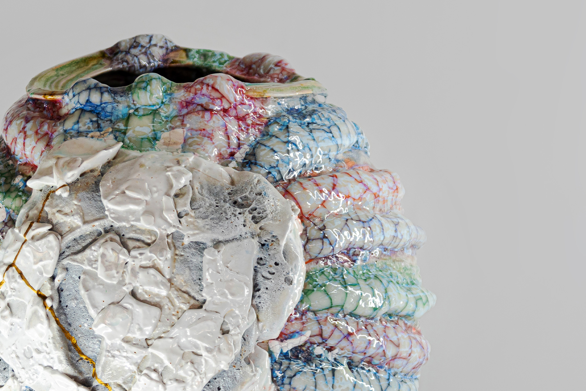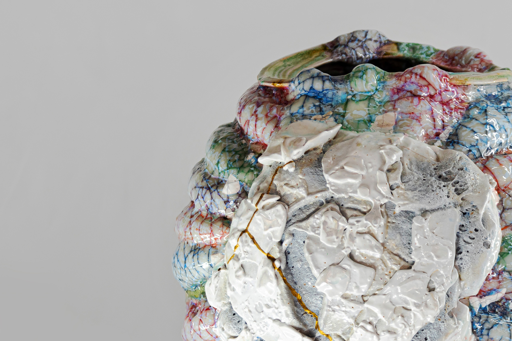 At the same time, Ujiie’s practice is deeply informed by the conventions of traditional Japanese pottery, particularly in his use of technical fusions that bridge historical methods with contemporary form. By adapting the kintsugi lacquer mending process, he brings a layered sensibility to his practice; his unpredictable glazes—thickly applied and often suggesting a synthetic gloss—conjure a striking sense of spontaneity within otherwise carefully constructed, deliberate forms. These works gesture toward utility, subtly alluding to conventional vessels or architectural fragments—recalling Betty Woodman’s reimagining of ceramic traditions through hybrid, architectonic gestures—while their meanings unfold through multiple layers of interpretation and ambiguity. His ceramics also evoke an animated quality: bulbous, soft-edged, almost creaturely forms that suggest narrative or anthropomorphic character, aligning with the expressive, sculptural approach of Ken Price and inviting viewers to engage with them as lively, enigmatic presences rather than mere objects.