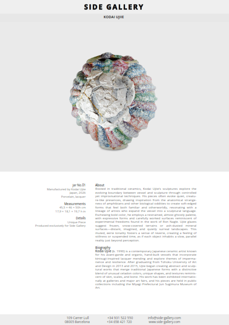 Kodai Ujiie (b. 1990) is a contemporary Japanese ceramic artist known for his avant-garde and organic, hand-built vessels that incorporate kintsugi-inspired lacquer mending and explore themes of impermanence and resilience. After graduating from Tohoku University of Art and Design in 2013 and 2015, Ujiie began creating abstract and sculptural works that merge traditional Japanese forms with a distinctive blend of unusual celadon colors, unique shapes, and textures reminiscent of skin, scales, and bone. His work has been exhibited internationally at galleries and major art fairs, and his pieces are held in public collections including the Miyagi Prefectural Jun Sugimura Museum of Art.