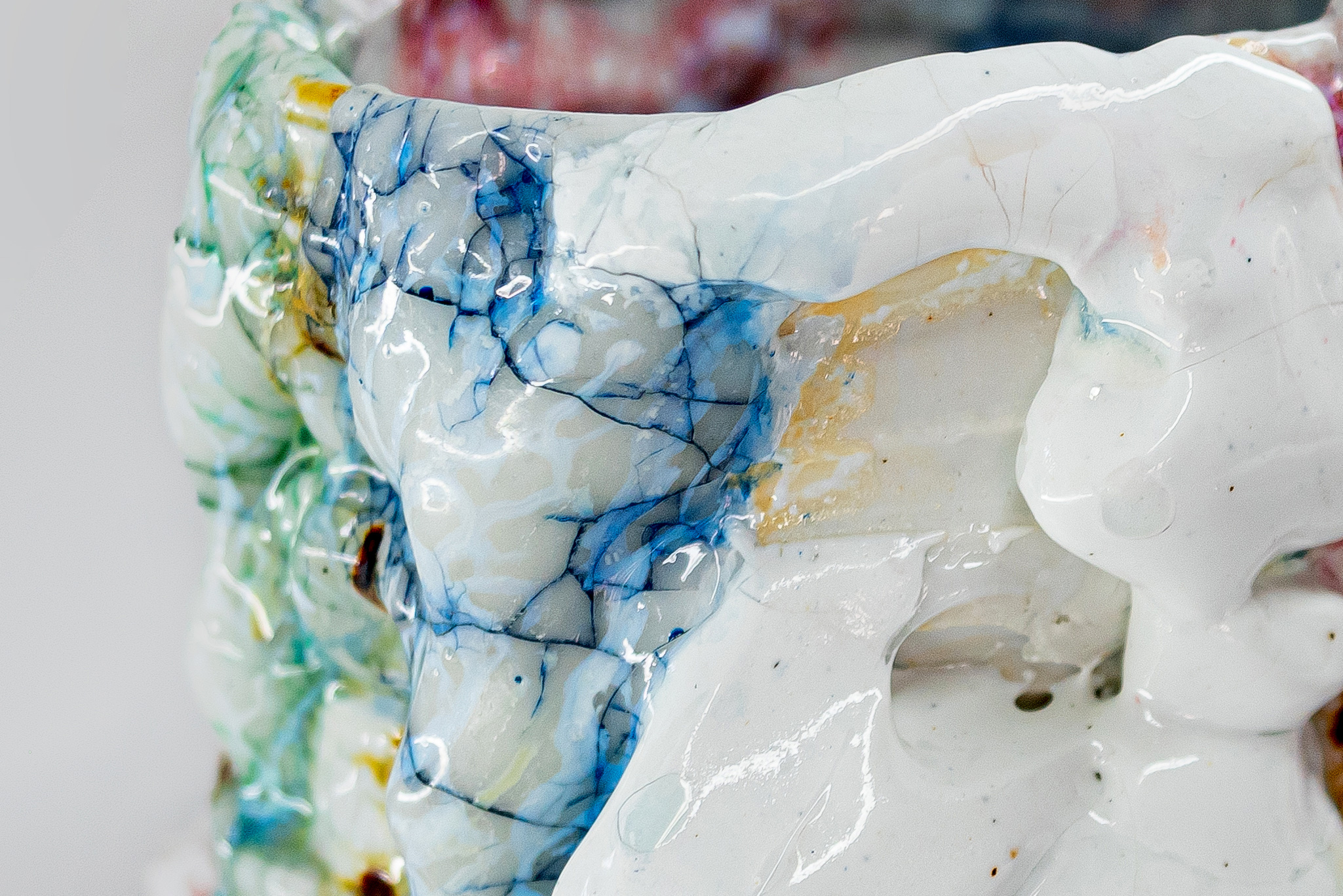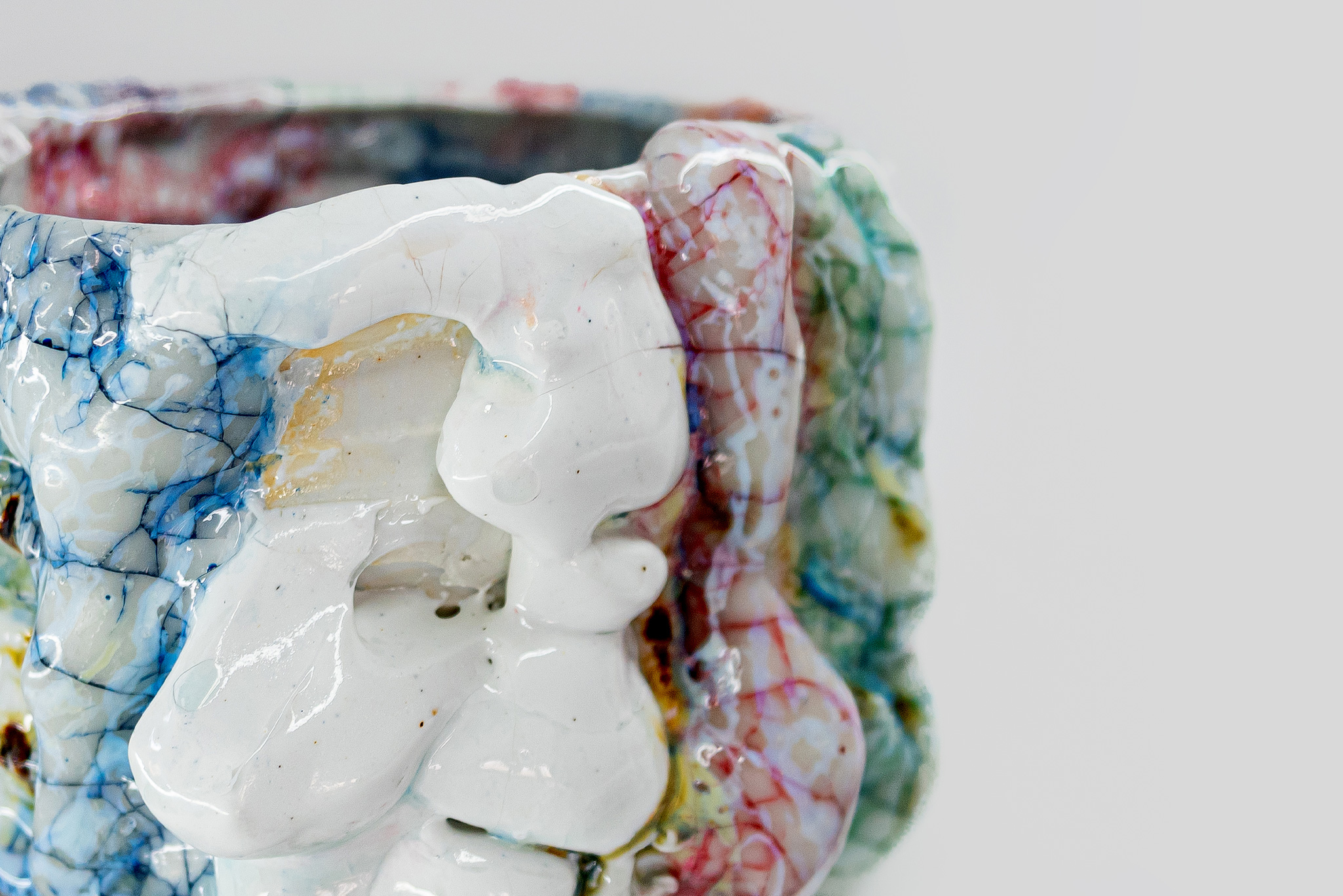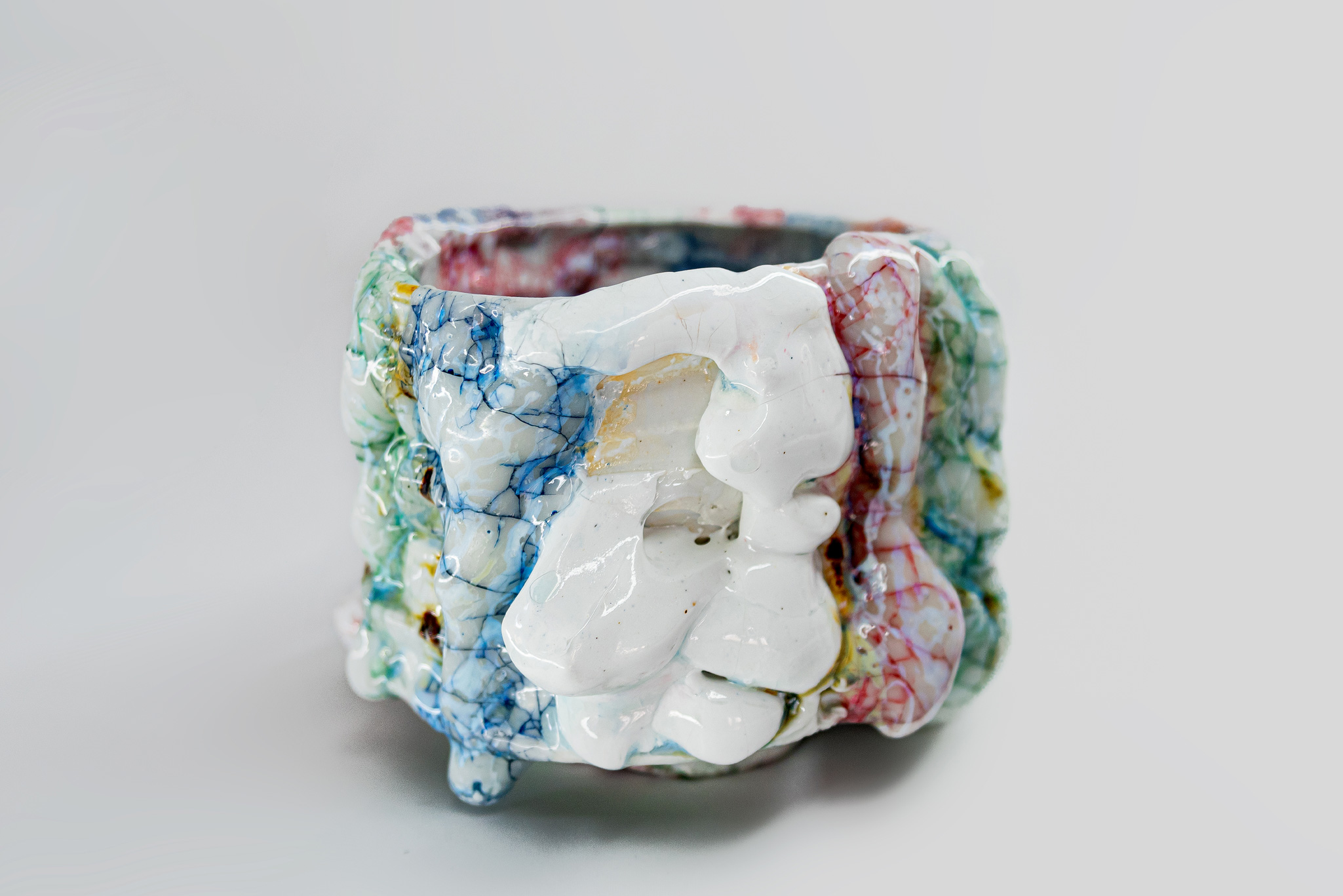At the same time, Ujiie’s practice is deeply informed by the conventions of traditional Japanese pottery, particularly in his use of technical fusions that bridge historical methods with contemporary form. By adapting the kintsugi lacquer mending process, he brings a layered sensibility to his practice; his unpredictable glazes—thickly applied and often suggesting a synthetic gloss—conjure a striking sense of spontaneity within otherwise carefully constructed, deliberate forms. These works gesture toward utility, subtly alluding to conventional vessels or architectural fragments—recalling Betty Woodman’s reimagining of ceramic traditions through hybrid, architectonic gestures—while their meanings unfold through multiple layers of interpretation and ambiguity. His ceramics also evoke an animated quality: bulbous, soft-edged, almost creaturely forms that suggest narrative or anthropomorphic character, aligning with the expressive, sculptural approach of Ken Price and inviting viewers to engage with them as lively, enigmatic presences rather than mere objects.