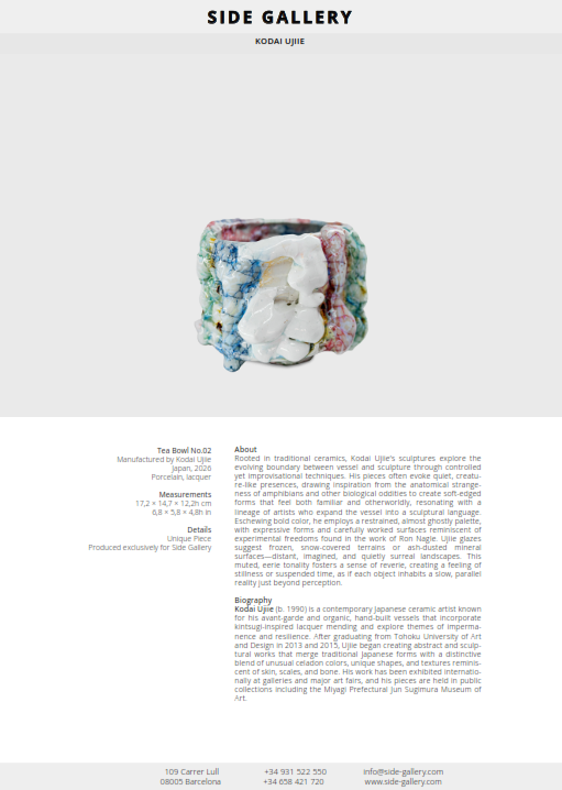 Kodai Ujiie (b. 1990) is a contemporary Japanese ceramic artist known for his avant-garde and organic, hand-built vessels that incorporate kintsugi-inspired lacquer mending and explore themes of impermanence and resilience. After graduating from Tohoku University of Art and Design in 2013 and 2015, Ujiie began creating abstract and sculptural works that merge traditional Japanese forms with a distinctive blend of unusual celadon colors, unique shapes, and textures reminiscent of skin, scales, and bone. His work has been exhibited internationally at galleries and major art fairs, and his pieces are held in public collections including the Miyagi Prefectural Jun Sugimura Museum of Art.