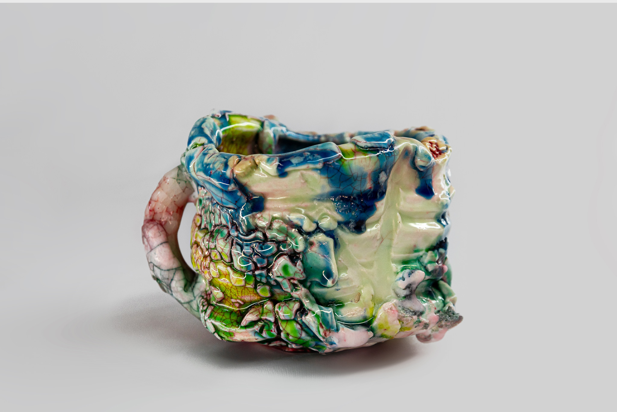 Rooted in traditional ceramics, Kodai Ujiie’s sculptures explore the evolving boundary between vessel and sculpture through controlled yet improvisational techniques. His pieces often evoke quiet, creature-like presences, drawing inspiration from the anatomical strangeness of amphibians and other biological oddities to create soft-edged forms that feel both familiar and otherworldly, resonating with a lineage of artists who expand the vessel into a sculptural language. Eschewing bold color, he employs a restrained, almost ghostly palette, with expressive forms and carefully worked surfaces reminiscent of experimental freedoms found in the work of Ron Nagle. Ujiie glazes suggest frozen, snow-covered terrains or ash-dusted mineral surfaces—distant, imagined, and quietly surreal landscapes. This muted, eerie tonality fosters a sense of reverie, creating a feeling of stillness or suspended time, as if each object inhabits a slow, parallel reality just beyond perception.